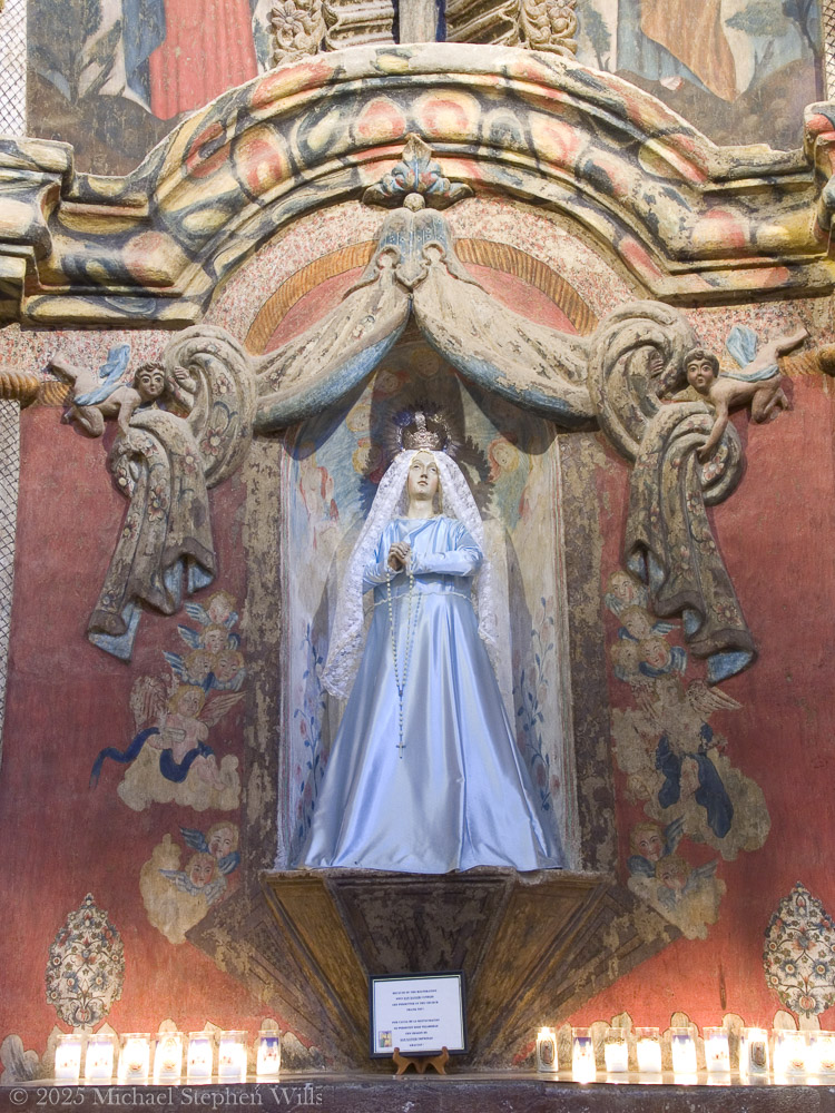 The Virgin Mary appears in blue and white—colors of purity, serenity, and devotion. She stands among votive candles and gazes gently ahead, hands joined in prayer. Her dress flows around her, anchored by a rosary that loops downward like an anchor to the earth. Angels and cherubs flank her in painted stucco, echoing heaven’s embrace. This is not the triumphal Mary of high cathedrals but a deeply human one, a mother, accessible and protective. The candles flickering below affirm that faith is alive here, not simply preserved.