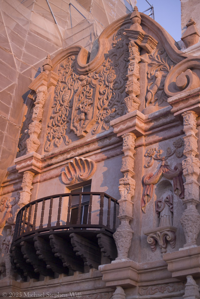 Stepping into the courtyard, I tilt my head back to absorb the facade’s details. The ornate Baroque façade is a symphony of carved plaster and painted relief, an exuberant blend of Moorish, Spanish, and Indigenous influences. Faded yet still vivid, saints and angels watch from their niches on the church front. Every arch and cornice is edged in shadow and dawn light, revealing craftsmanship considered one of the finest examples of Mexican Baroque architecture in the United States