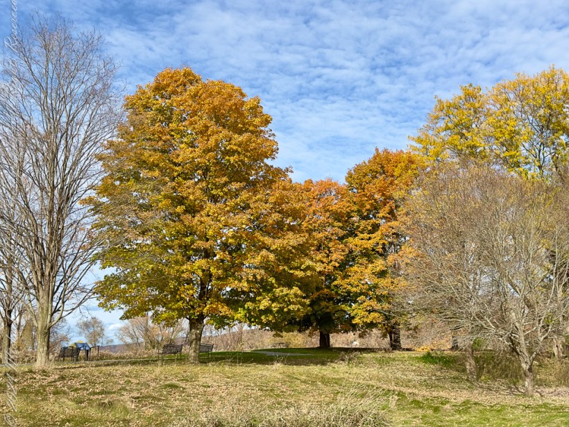 Our journey concludes with this sweeping landscape from the Treman Park Lake Loop. The towering Sugar Maples (Acer saccharum) dominate the view, their crowns now a rich, golden orange — a signature of northeastern forests. Known as the tree that gives us maple syrup, Sugar Maples are quintessential symbols of autumn in the Finger Lakes.