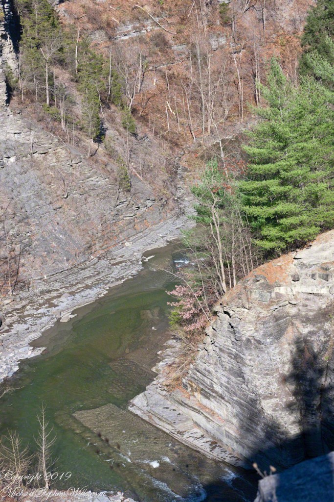 I sat down, letting the moment settle around me. In the gorge below, water moved quietly through sculpted shale, the same layered gray that once caught my attention through a camera lens long packed away. From this overlook, the view had scarcely changed: stone and water, green clinging to cliff, sky rolling in above it all. My photograph captures it now just as it might have then—perhaps from the same angle. The gorge unfolding in a graceful arc, with trees perched impossibly along the sheer face.