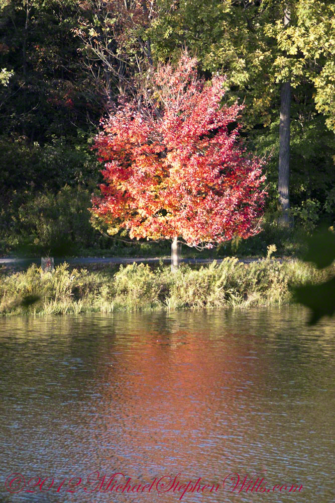 On a serene autumn afternoon by Beebe Lake, a solitary red maple stood out against the backdrop, showcasing its vibrant colors and resilience, symbolizing autumn’s fleeting beauty.