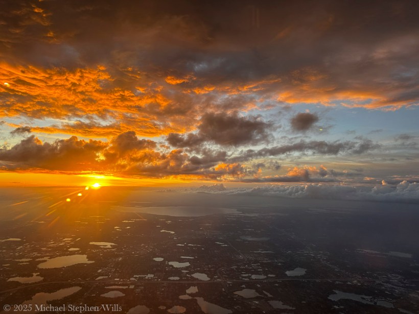 Wheels left the earth with a whisper, a moment of weightless suspension, Gravity yielding to flight as the city unrolled far beneath us. Golden horizons drew rivers of fire through infinite heavens, Burning the clouds into embers that drifted in luminous torrents.