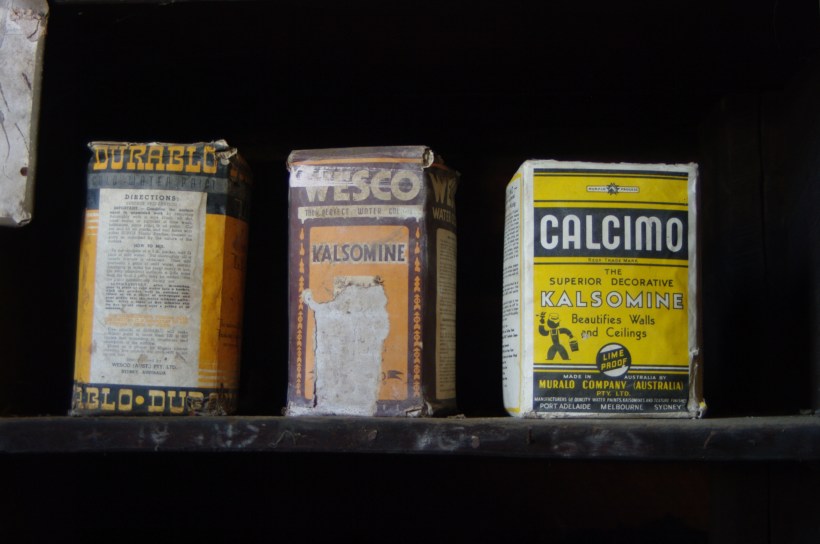 Upon our return, researching “whitewash,” if found this photograph from the Yarloop railway workshops Yarloop, Western Australia. There, on a shelf, where three old boxes sat like relics: DURABLO, WESCO, and CALCIMO. All contained kalsomine—the powdered form of lime paint. CALCIMO promised to “beautify walls and ceilings” and was proudly marked “LIME PROOF.” There was something quietly heroic in that. Lime-proof, as though against time itself.