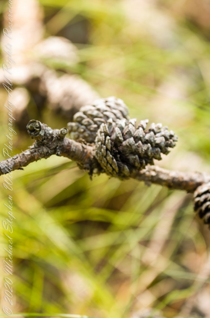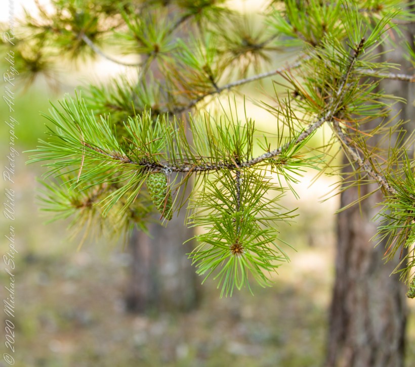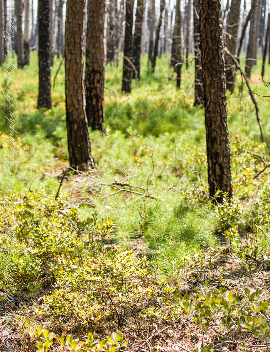 The 115,000 acres of Wharton State Forest are predomenantly Pitch Pine, scientific name Pinus Rigida, and AKA Black Pine and Hard Pine. Climb the fire tower of Apple Pie Hill, in all directions will be a sea of these trees interspersed here and there with occasional oaks. Cedars mark water courses. These photographs, unless otherwise identified, were taken deep in the forest, near where Quaker Bridge spans the Mullica River.