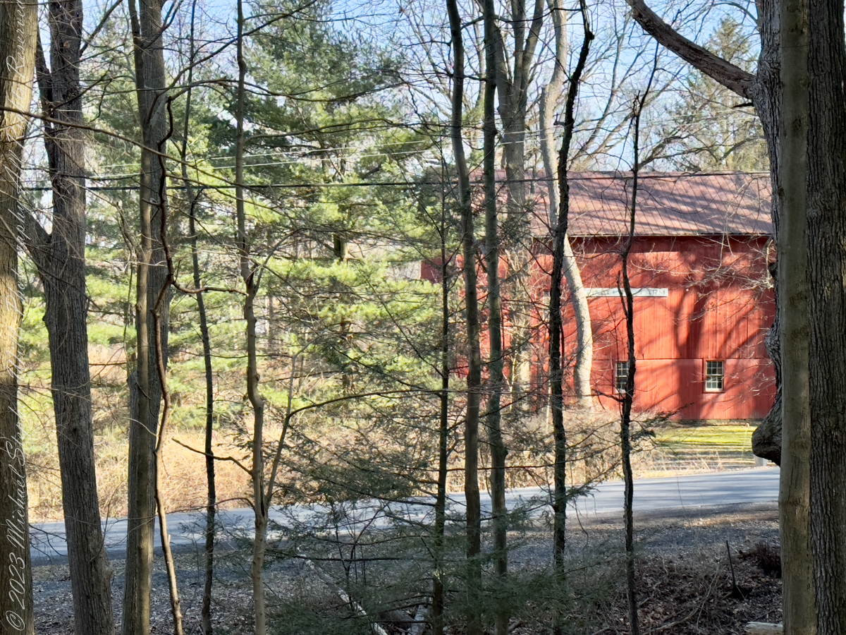 Ice eventually nudged my walk onto Gorge Road, which parallels the South Rim Trail like a quieter narrative strand. Here, the landscape shifts from wild drama to human memory. A curve in the road reveals a farmhouse, modest and fragile beside its outsized barn. In winter, the absence of leaves makes the scene stark and honest. The farmstead buildings do not ask for nostalgia; they simply stand, bearing witness to lives tethered to this steep land. The structures emerge gradually as I walk downhill, as if the land itself were choosing when to reveal them.
