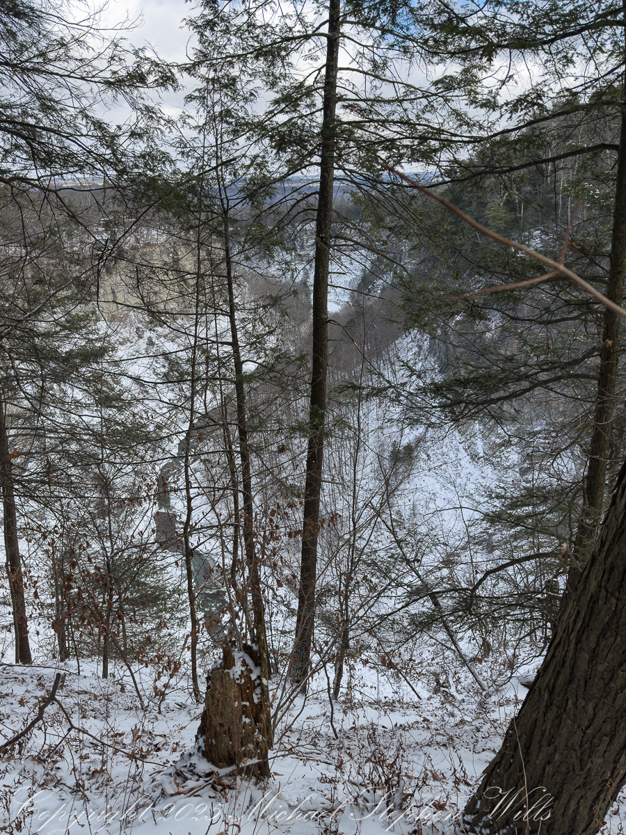 Rejoining the rim trail for the final climb north, the gorge offers repeated overlooks where the Gorge Trail can be seen threading below. These moments collapse distance: walker and walker, above and below, bound by the same route at different elevations. Over the course of roughly three miles and almost 600 feet of cumulative elevation change, effort becomes its own reward. Two hours pass not as measured time but as a sustained attentiveness, a gift winter offers to those willing to meet it on its terms.