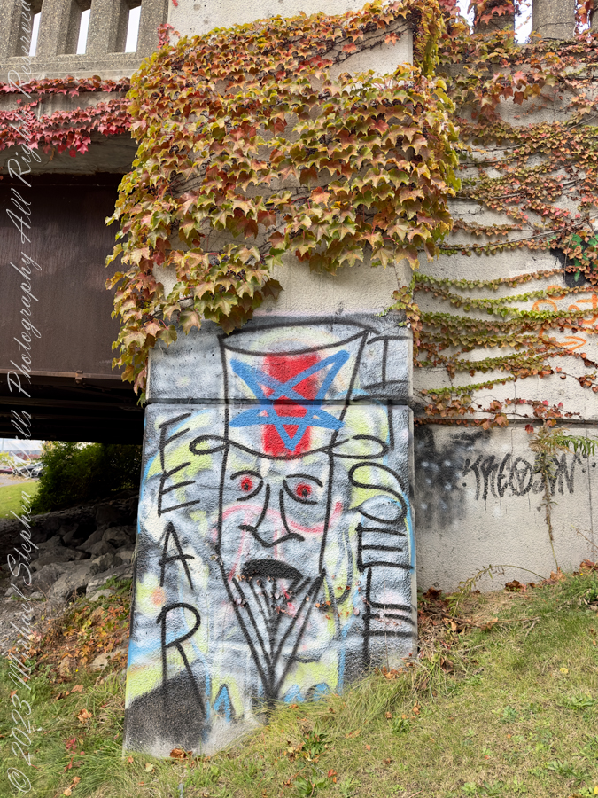 In Ithaca, a local artist made a bridge over Cayuga Lake Inlet their canvas, painting an eccentric wizard, dubbed Alphazar, in urban attire and a range of emotions. Reactions range from surprise to contemplation, giving the bridge a surprising hotspot quality. Increasing ivy coverage sparks thoughts of nature reclaiming the urban area. This art piece reiterates the spontaneous nature of humor and art.