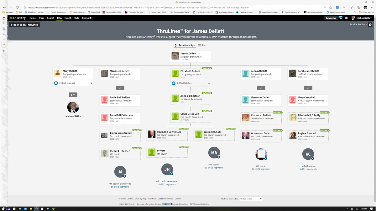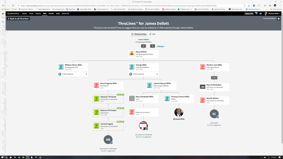 From my father and sisters I knew to search southern New Jersey. The United States decennial census, “thank you Constitution,” listed a George and Margaret Wills with my grandfather among their children. Great Grandfather George Wills was listed as a 14 year old child of George and Mary Wills in the 1850 census. How could I be sure? DNA technology with internet based social interaction helped there. I was contacted by a Dellett descendant, identified by DNA as a fourth cousin, who claimed Mary Wills as a double great aunt, the daughter of James and Ann Dellett. Here is a screen capture of an Ancestry “ThruLines” analysis showing the six living ancestors of James and Ann in the database. I removed the names and photos of the other five to preserve privacy. The DNA fourth cousin relationship was an exact match to the family tree.