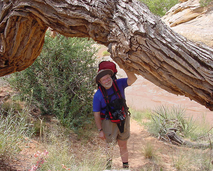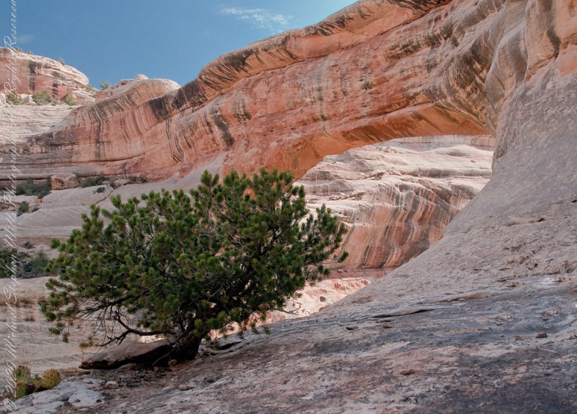 Here is a unique tree in the unworldly environment near Sipapu Bridge, Natural Bridges National Monument. I am looking from under a huge Cottonwood tree trunk, in the above photography taken by my wife Pam.