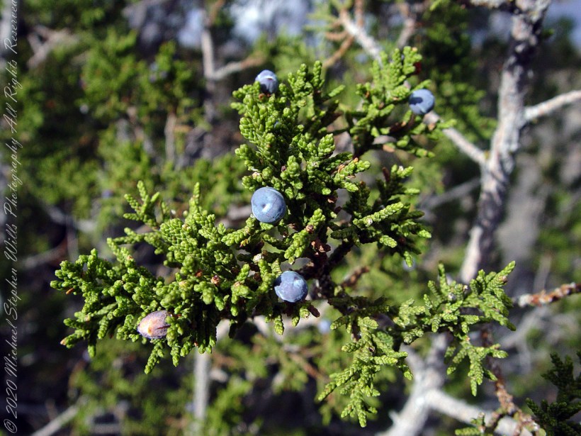 Not shown here are the fascinating (for me, anyway) berries (also called “cones” or “berry-cones”). Each contains seeds, is hard and green, about a quarter inch across. If you are brave enough to eat it, you find it to have a pleasant, resinous flavor (a taste like the aroma of pine cones). These seeds are the manner in which the Utah Juniper spreads. The tree has both male and female parts and can fertilize itself, so it is possible an isolated stand can all spring from a single individual (unlike humans, for example).