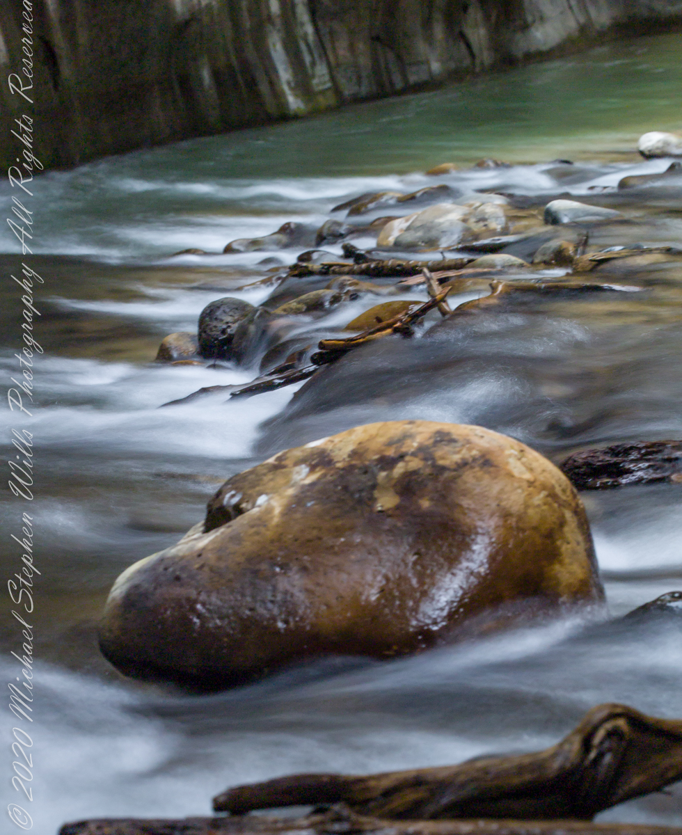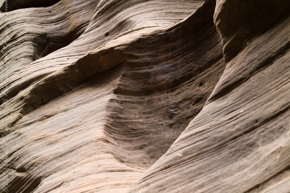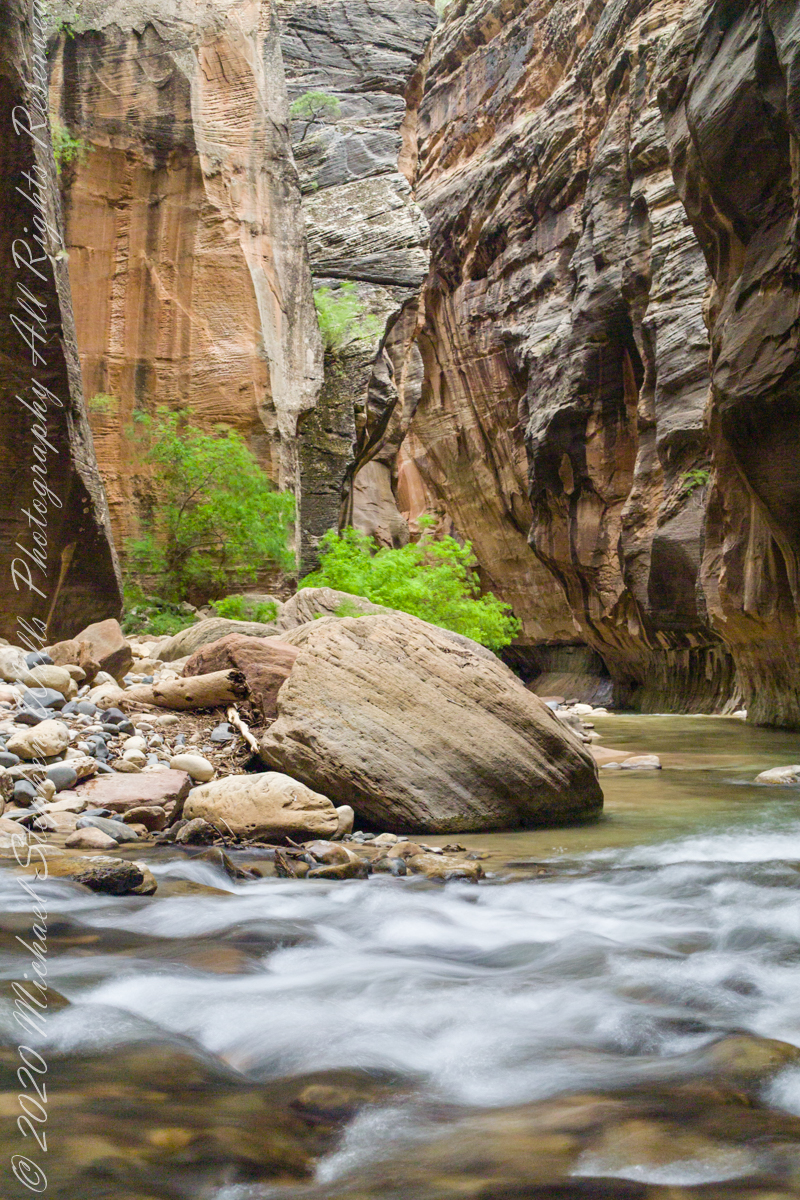 In Zion National Park, where towering sandstone cliffs rise from the desert floor, the Virgin River weaves a persistent and graceful thread through deep canyons carved over millennia. The river is the creative force behind Zion’s signature landscape, sculpting stone with a patient hand. Among its greatest achievements is the Narrows—a sinuous gorge where water and light perform a timeless duet. The two photographs shown here draw us into an intimate corner of that realm, where water flows past a rock face marked by both subtlety and drama.