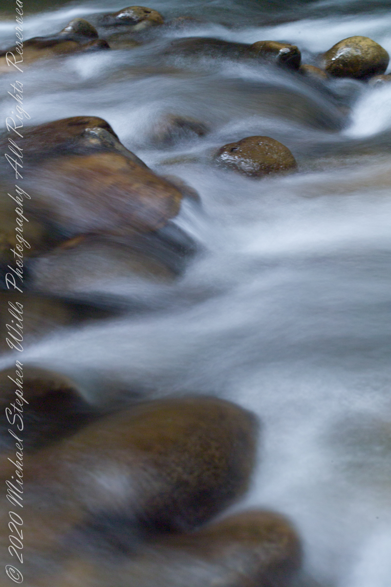 In the first photograph, the scene is bathed in soft, diffused light, lending a quiet tone to the flowing water and the weathered rock face. The surface of the Virgin River becomes a silky sheet, its motion captured with long exposure so that it seems to glide effortlessly past the cluster of smooth stones in the foreground. Here is a deep calm—the kind that can be heard in the hush of water over stone and felt in the breathless silence of a canyon morning.