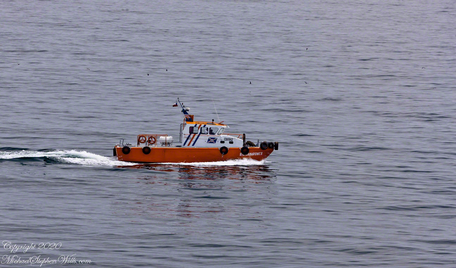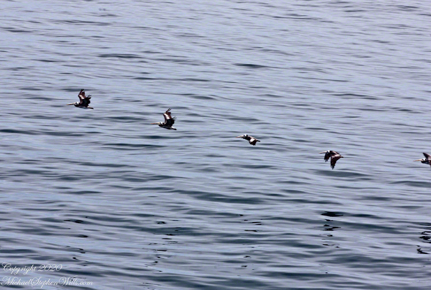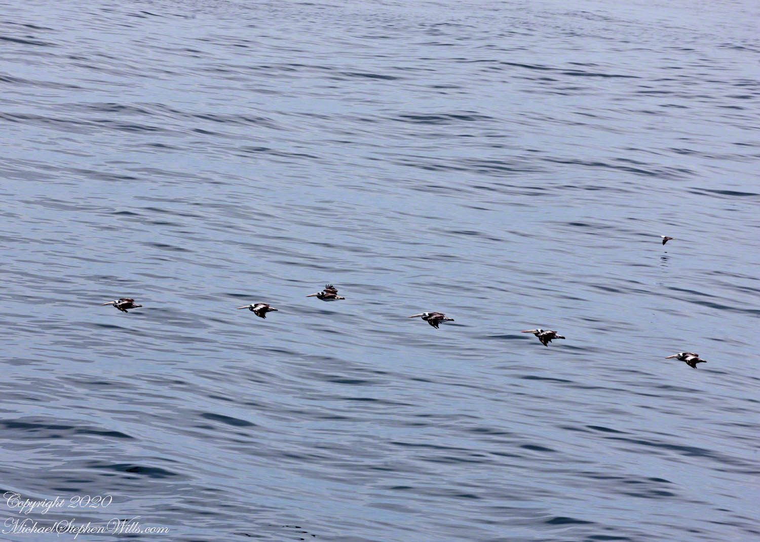 Beyond the pilot boat, shorebirds fly in rhythmic formation, a sight both familiar and comforting. Using the zoom (300mm) of my variable zoom lens, I identify these birds as pelicans, their elegant, synchronized flight a mesmerizing display against the vast expanse of water.