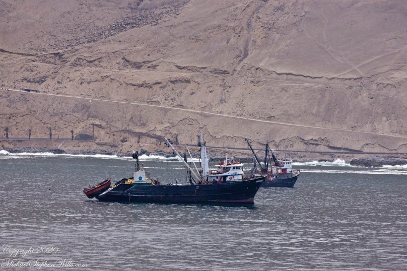 The post header photograph captures Punta Negra, the northern boundary of the harbor. The rugged, imposing cliffs of Punta Negra rise sharply from the water, their stark beauty accentuated by a white layer of diatomaceous earth running along the coast. This geological feature, first encountered at our last port in Mollendo, Peru, adds a unique texture to the landscape, a silent testament to the natural history of the region. The white layer, created by the accumulation of microscopic algae over millennia, stands out vividly against the darker rock, a reminder of the Earth’s ancient past.