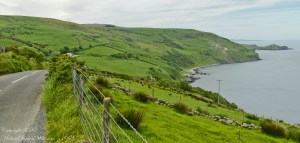 Tor in Irish is a steep rocky height. Likewise, Corr means odd, uneven, rounder, convex, curved, peaked, projecting, smooth. Combined Torcorr is the townland where we stopped on the Torr Road, halted by our wonder at this sight. In the distance, Torr Head projects into North Channel, the closest land to Scotland. Following the coast, the cliffs in front of Torr Head is home to numerous sea birds. The curved bay is named Loughan, the rocky sand beach are ruins of cottages emptied by Irish emigration. The white building is Saint Mary’s Star of the Sea Roman Catholic Church. County Antrim, Northern Ireland.