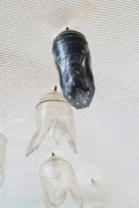 As the moment of emergence approaches, the skin of a Monarch chrysalis becomes translucent to reveal the butterfly compressed into that small space.