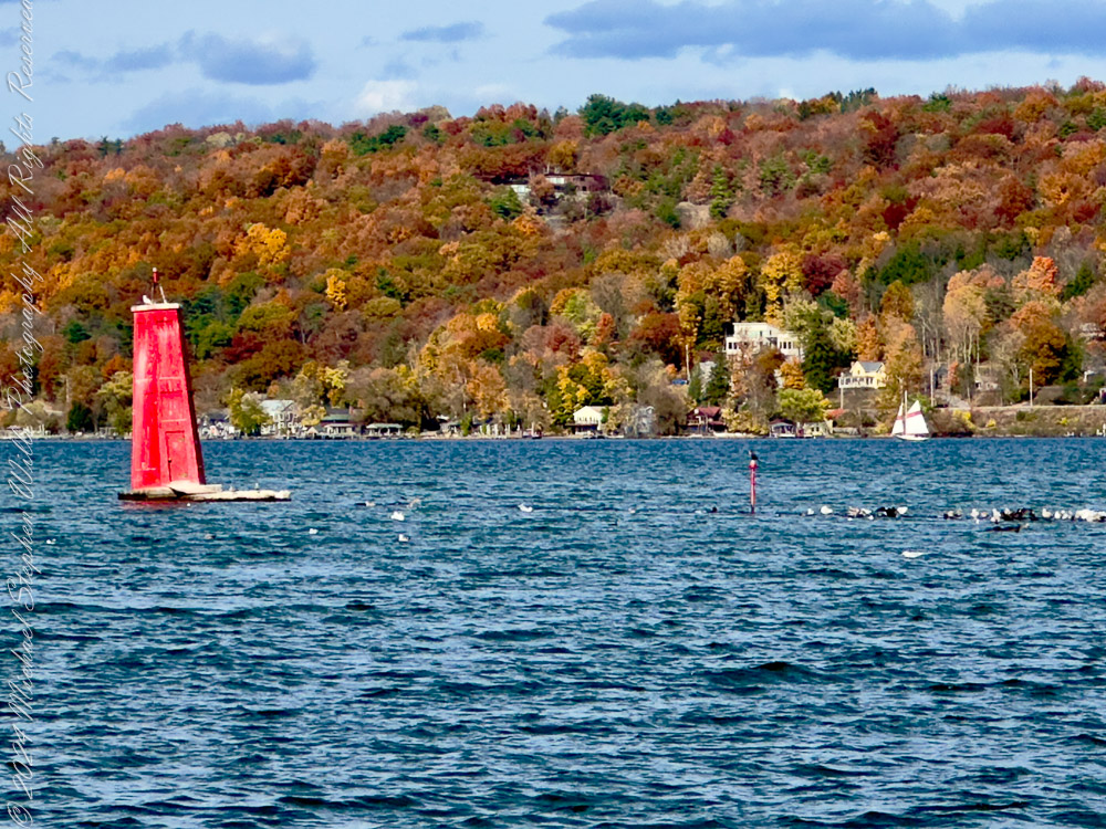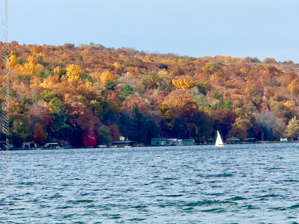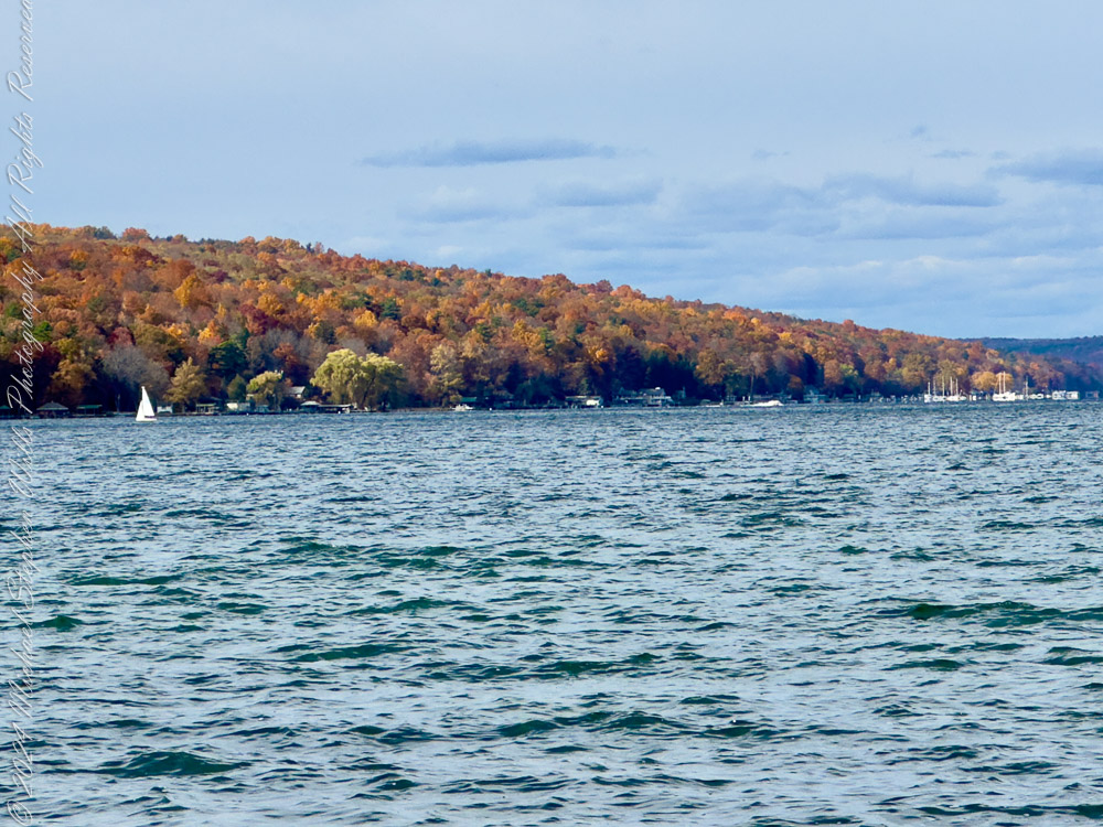 I pause at the overlook, where the trail skirts the cliffs. From this height, the view opened to Cayuga Lake, vast and gleaming in the morning light. Across the water, the hills of the western shore softened into a watercolor horizon.