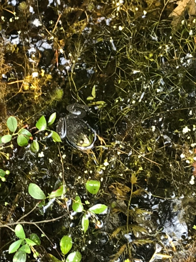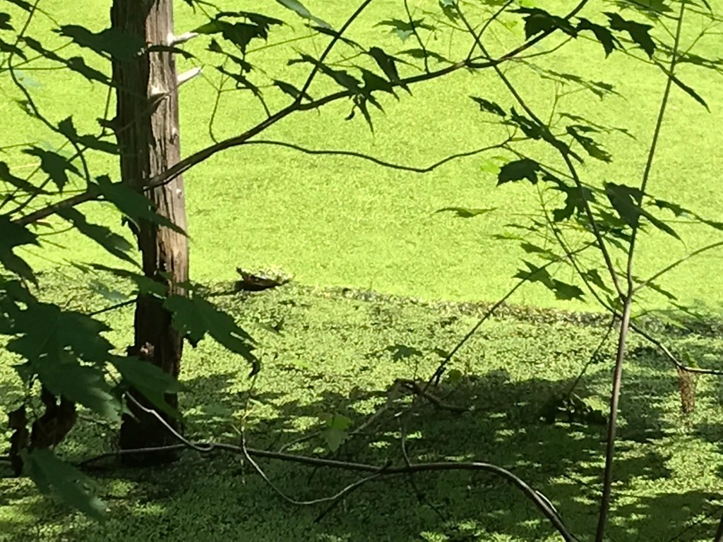A broad, fertile flat between gorge walls supports a dense growth of invasive creeping myrtle. Springtime there is a sprinkling of small blue flowers, this may be the source of another name, periwinkle, or lesser periwinkle.
