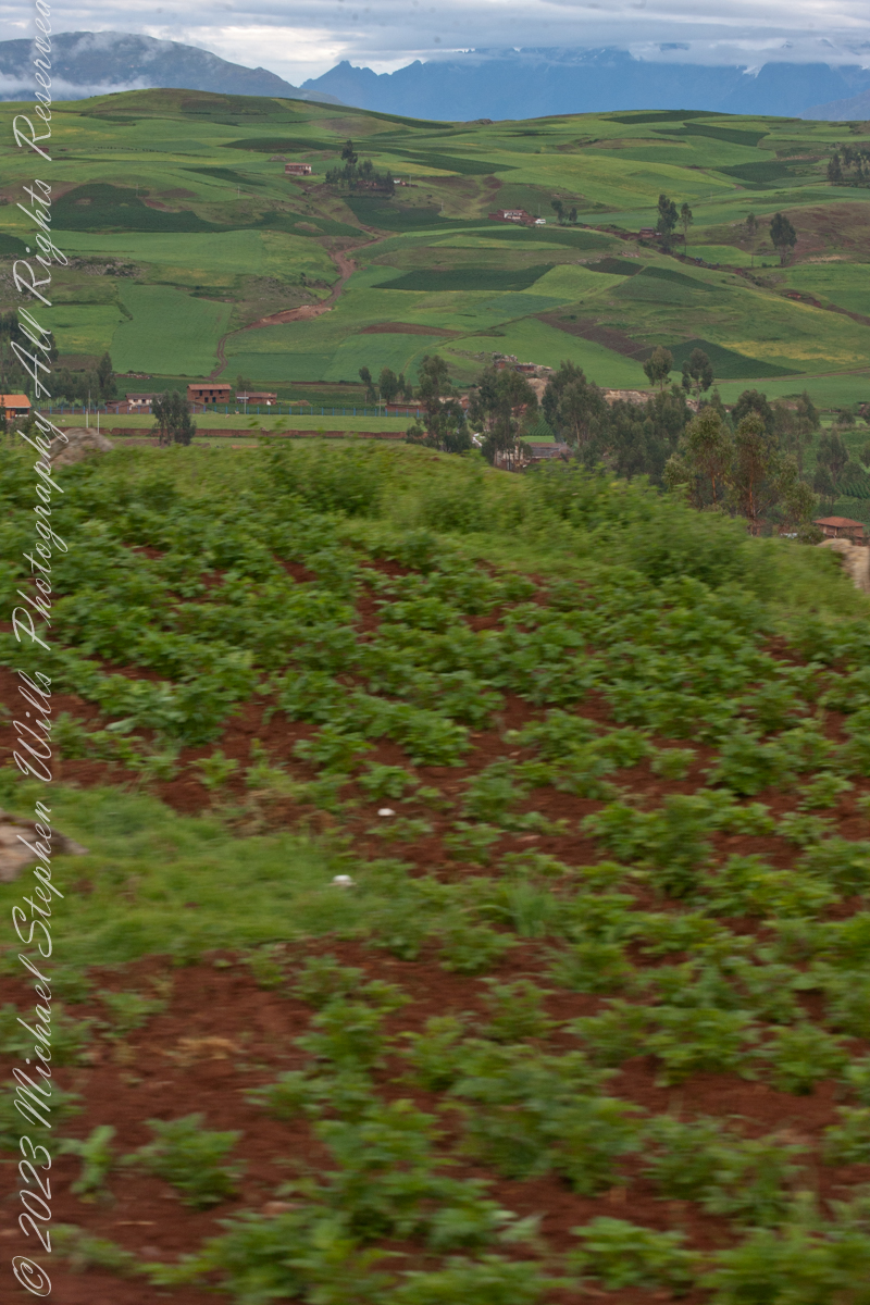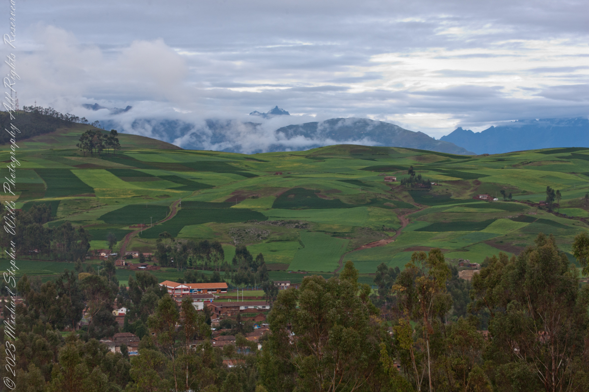 We overlook Raqch’i village and rich farmland to the distant Andean peaks, down below, out of view, is the Urubamba River that created the valley. The prominent, sharp distant peak is Pumahuanca of the Urubamba Mountain Range, at 17,448 feet (3.3 miles) altitude it is “only” the 179th highest of the Andes. Cusco Region, Urubamba Province, Huayllabamba District.