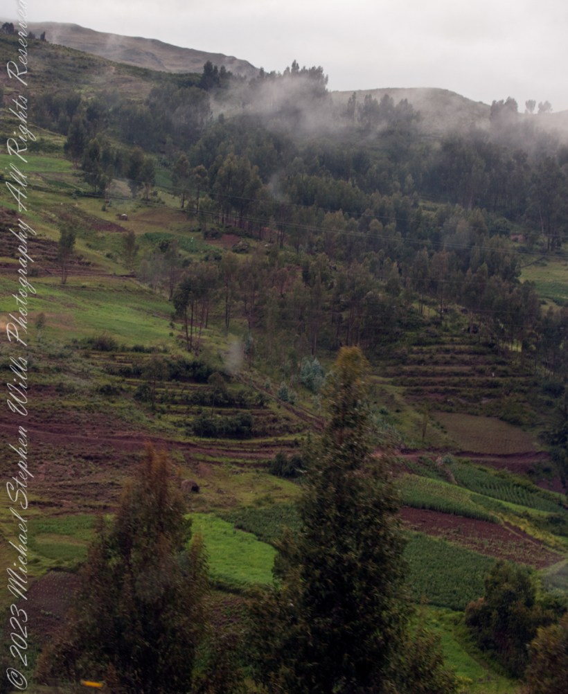 View of terraced fields from route 3S through the hills above Cusco, Peru. “In the South American Andes, farmers have used terraces, known as andenes, for over a thousand years to farm potatoes, maize, and other native crops.“