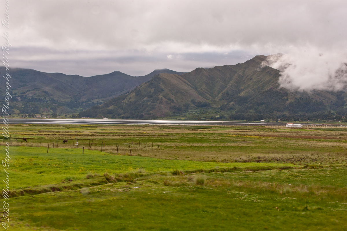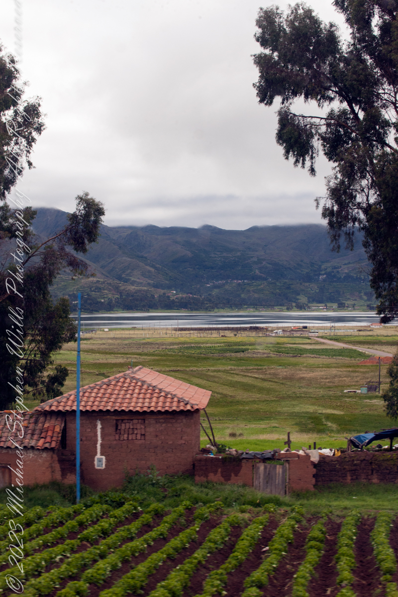 As seen from Avenue del EjércitoIts near Chinchero, Peru. Lagoon waters lap the distant, terraced andean foothills, look closely to see fish drying racks on the near shore, 11,270 feet altitude. Here, water boils at 191 degrees Fahrenheit, not 212.