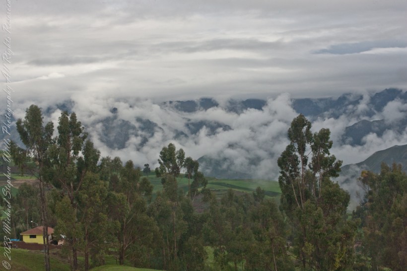 A few minutes past Chinchero the Avenue Mariscal Castilla bends dramatically to reveal this first view of the Sacred Valley of the Incas. The bend is the first of 14 switchbacks down to the river. The Andean peak Chicón is hidden in the clouds, at 18,140 feet is the 214th of the Andes.