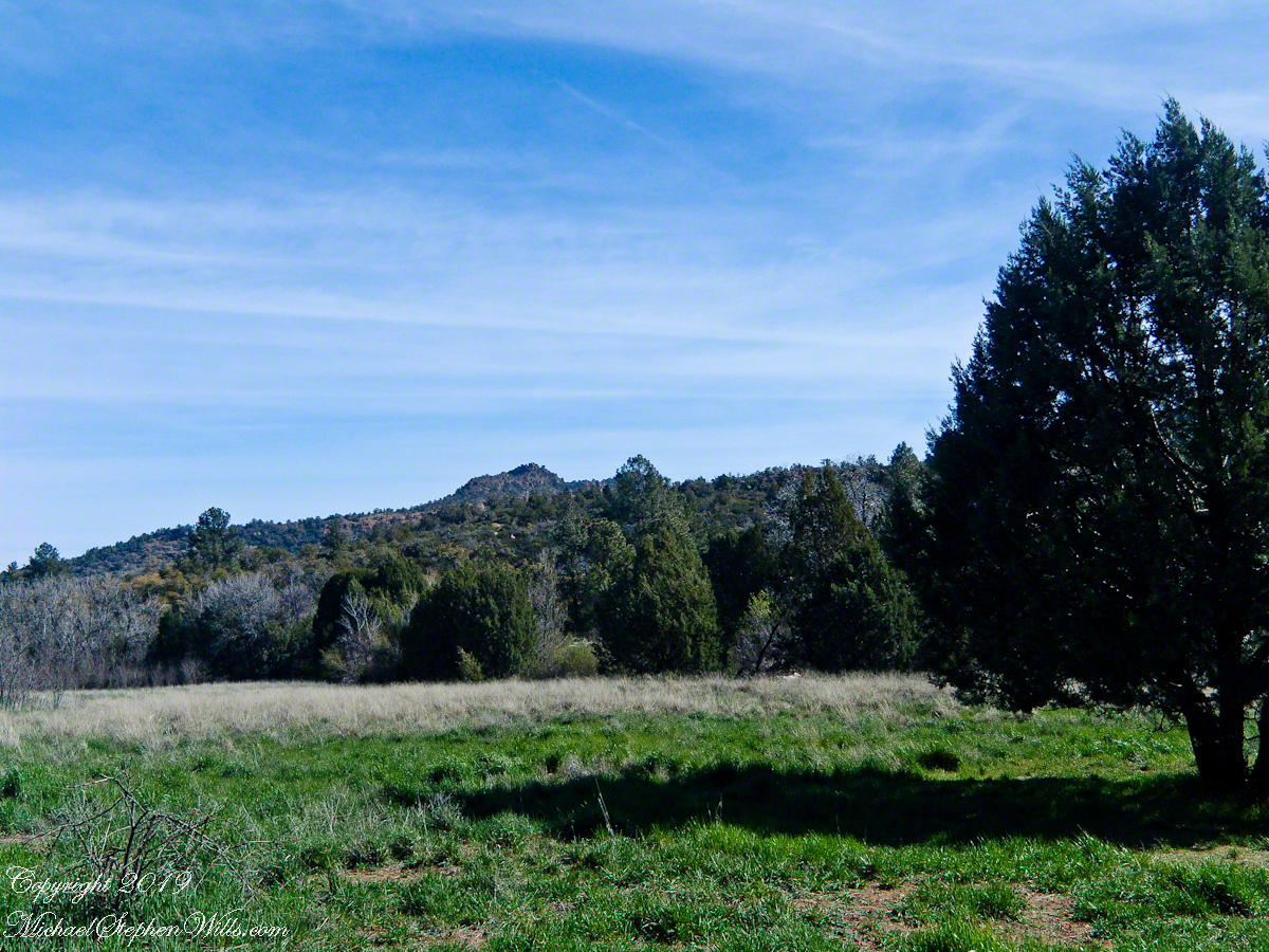 In the near distance a grass pasture slopes into Reavis Creek. The creek has flowing water in all but the longest dry seasons. By the way, the trail from Pine Creek is on the slopes of that conical feature in the distance, to the left.