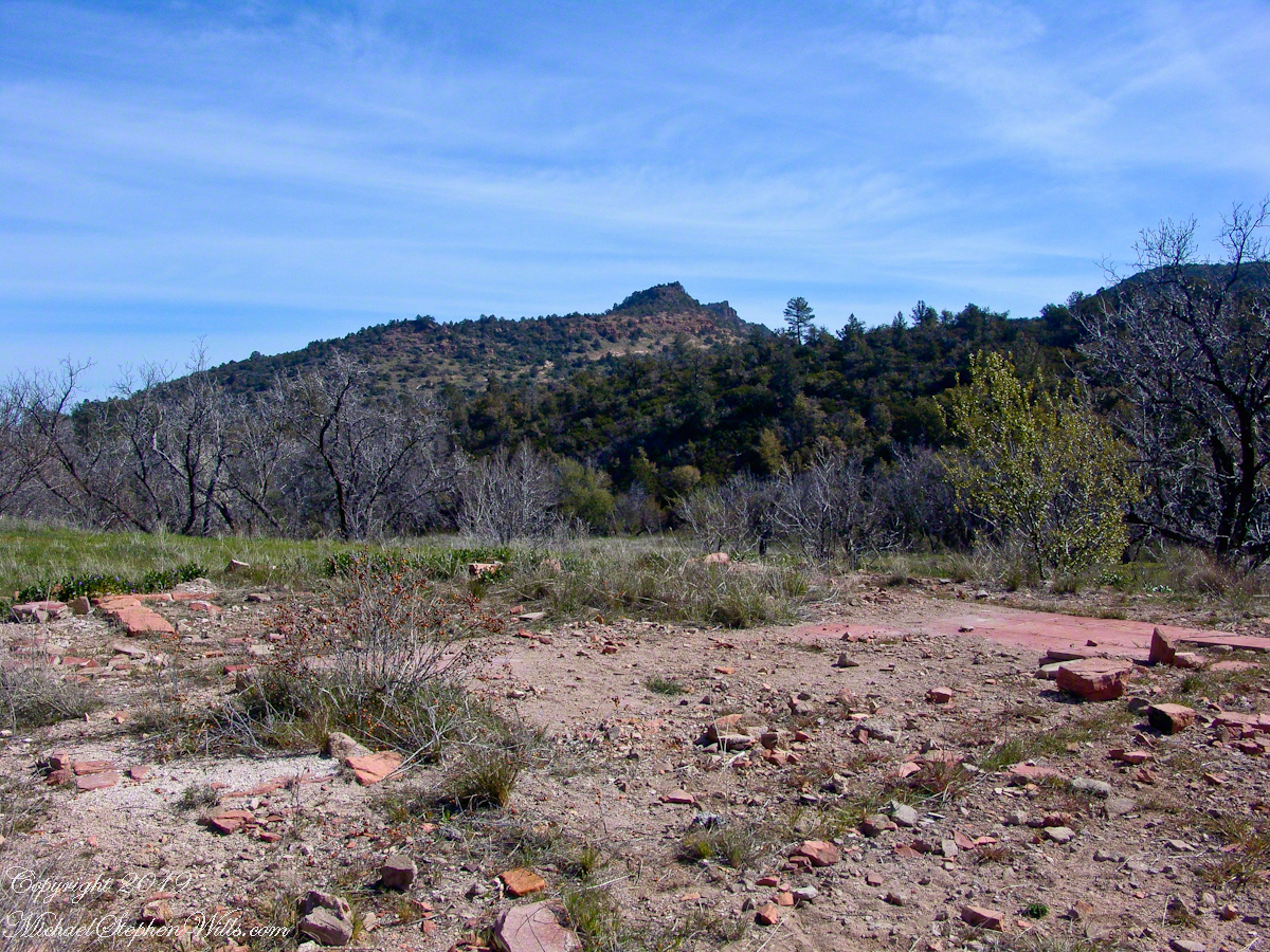 Looking from the former house site towards the Arizona Trail running beneath the distant red rock ridge. Not the fence rails on the left and apple trees in bloom.