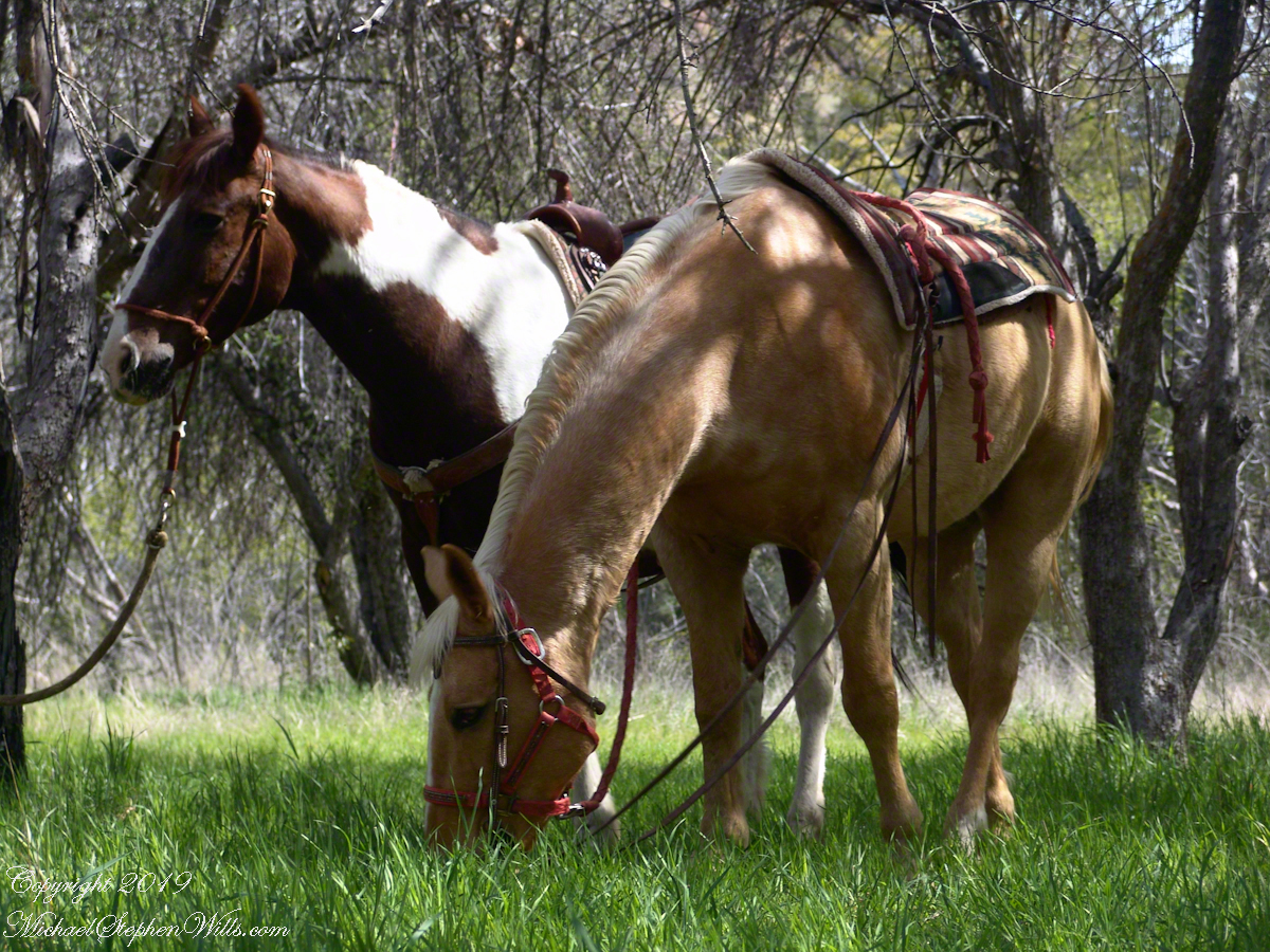 Nugget grazed unfettered. Colorado was tethered with plenty of slack for grazing. This photograph of the pair shows their personalities, Colorado edgy, Nugget content to feast while the grass is available.