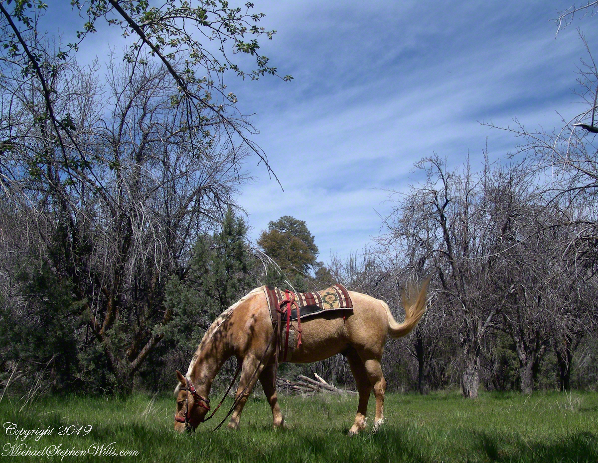 The following morning dawn rose from colorless darkness, thin birdsong and brightening high clouds. When the Searcher arrived around 8 am he was leading the pinto, introduced as Colorado, equipped with a western saddle instead of a pack. As an absolute novice trail rider, the Search would hold Colorado’s lead. The reins were wrapped around the saddle horn, leaving me to hang on and “enjoy the view” and swishing tail of the buckskin, named Nugget.