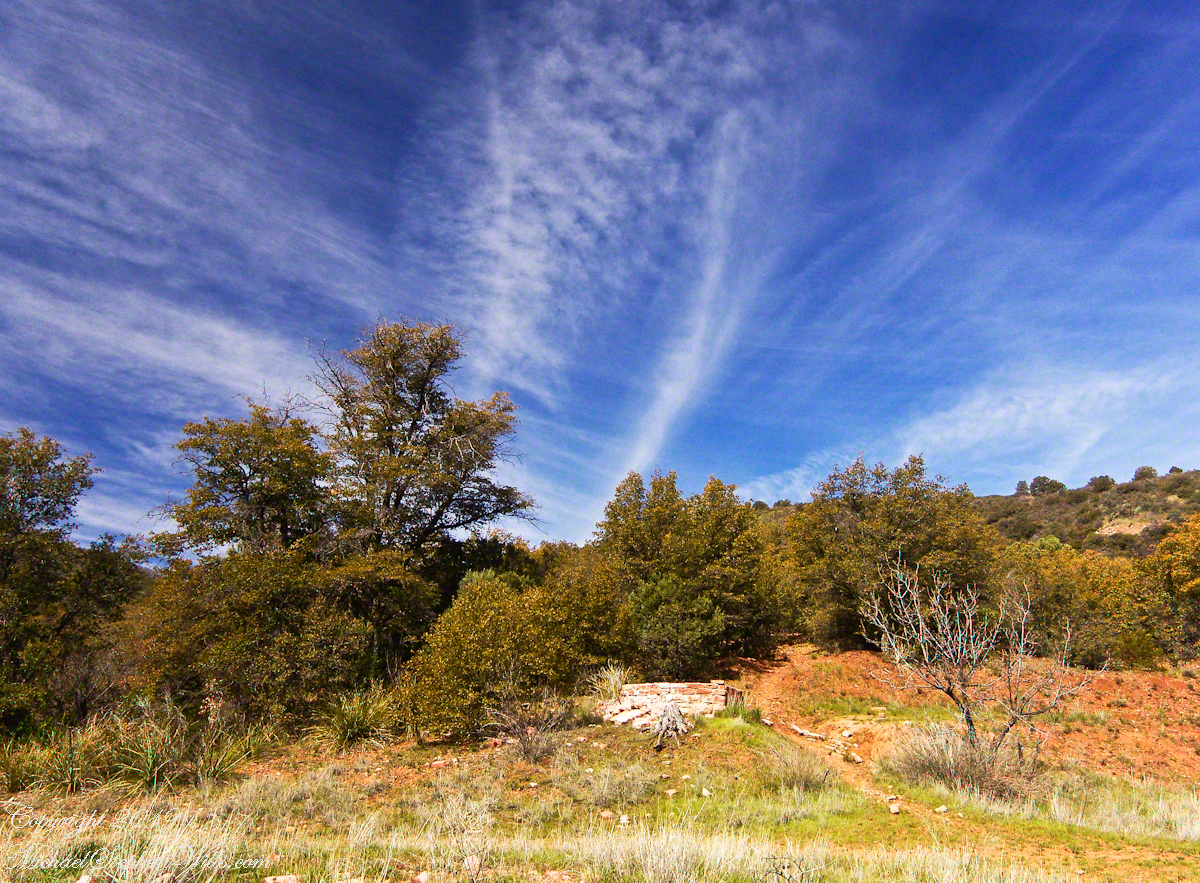 Eventually, the cliff descended with the path, steeply, to Reavis Creek, the valley floor and the intersection with the Reavis Ranch trail. Heading south the Reavis Ranch trail passes the site of a long abandoned ranch. What’s left of the adobe and stone ranch house is on a level valley elevation overlooking what used to be the corral and a large open expanse.