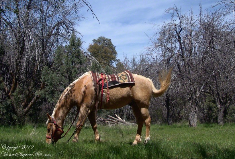 This tree is an outlier of a thick stand of several hundred trees to the north. The Searcher and I rode into the middle of the grove for a rest and chat. The horses were allowed to graze in the abundant new grass brought on by the winter rains.