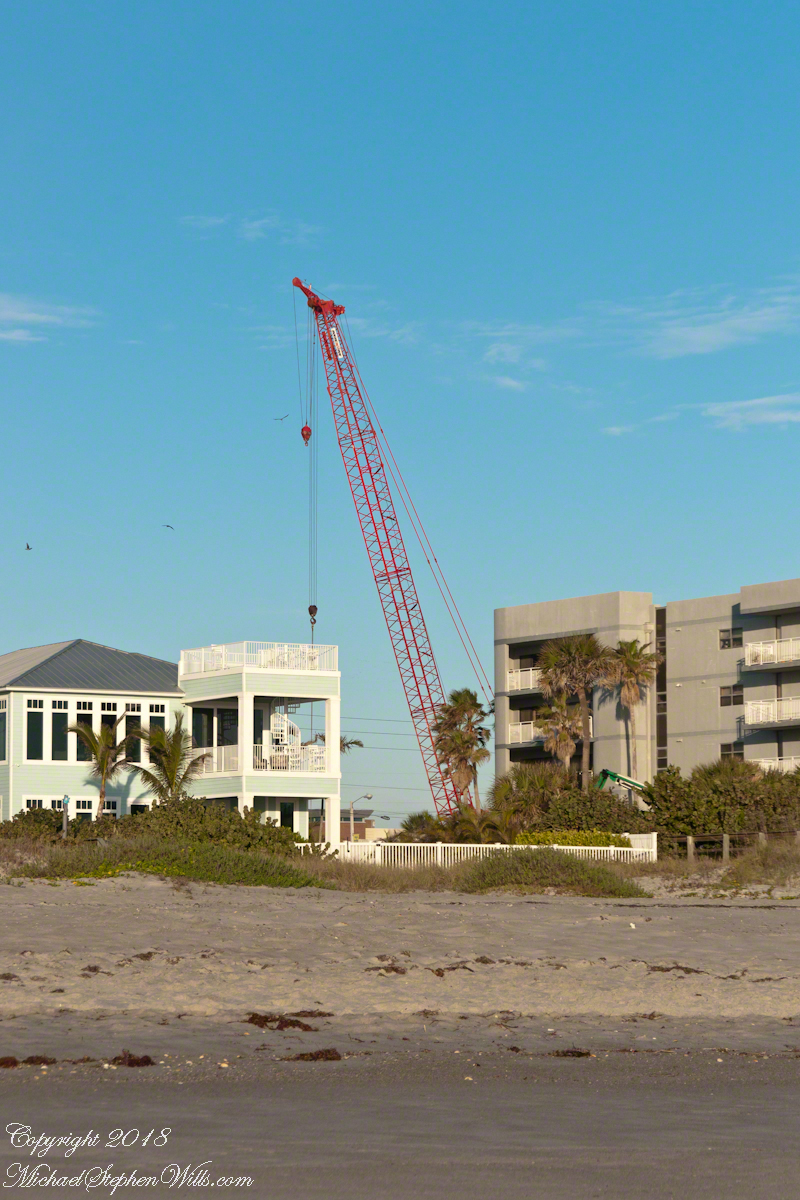 Early morning winter Cocoa Beach walks offer a new experience with each dawn be it a change in wind, light, or beach-combing offerings. This looming crane was a consistent specter the entire month, poised over a downtown parking garage under construction.