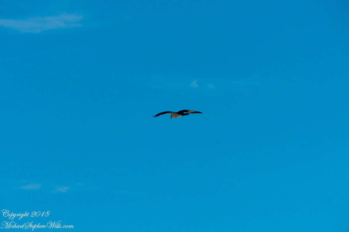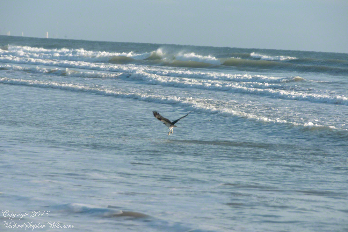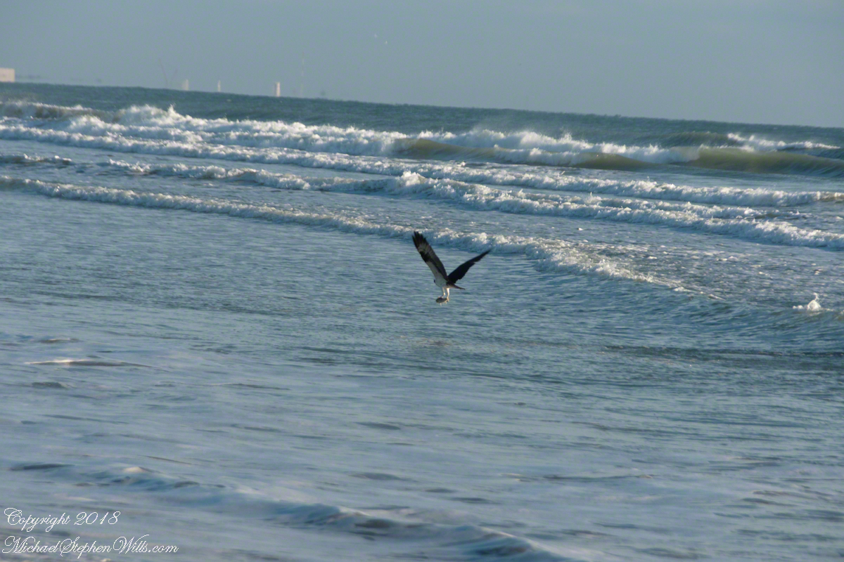 Each winter morning January 2019 I left our ocean side condo to walk the beach, taking equipment according to a whim. For this series I used the Sony Alpha 700 with a variable lens. In this first shot, the watchful pose of the hunting Osprey is apparent, long glide with head slightly down.