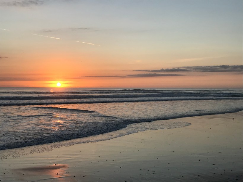 The sun disk broaches the Atlantic Ocean horizon on a clear January morning.