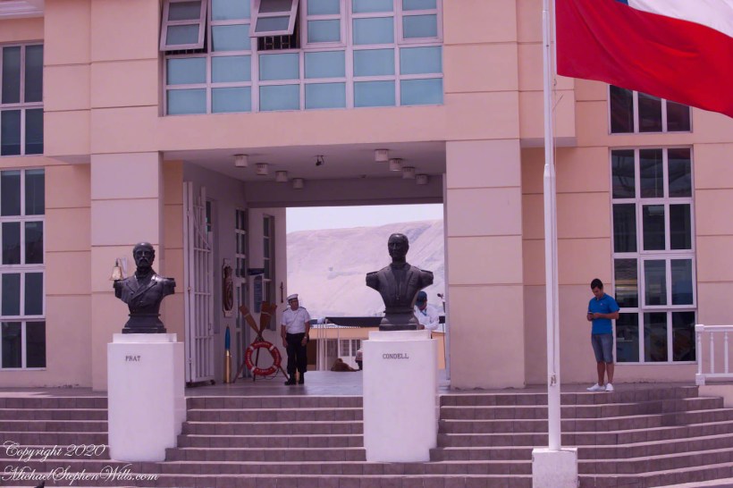 Larger than life busts of two Chilean heroes flank the entrance. We learned about Prat in an earlier post. While Captain Prat lost his life during the Battle of Iquique, Carlos Arnaldo Condell De La Haza, Captain of the schooner Virgen de Covadonga, escaped a larger and heavier gunned Peruvian ship, the armored frigate Independencia, sailing south.
