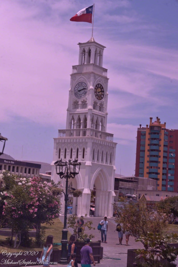 Declared a National Historic Landmark on July 13, 1987 this Clock Tower, together with the buildings surrounding it in the plaza (the Municipal Theater of Iquique, the building of the Workers Welfare Society of Tarapacá, the Casino Español and the Club Croata) is one of the most representative urban expressions of the “Saltpeter Period”, a time which saw much foreign investment. Built 1878 when Iquique was Peru territory, the partition walls of Oregon pine wood, a clock mechanism from England. Saltpeter, a nitrogen rich deposit on the Atacama desert surface, brought thousands of poor workers to exploit the natural resource and to, in turn, be exploited.