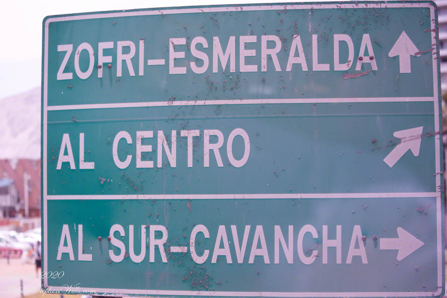 Shortly after the Maritime Government plaza is a crossroads with this interesting sign. The first line references two attractions. “ZOFRI” is the local abbreviation for the designation of Iquique as a port with tax advantages. The destination of this sign is a shopping mall. “Esmeralda” is the living museum I photographed from the tender. Our route to the Atacama desert took us through “Centro” with views of “Sur-Cavancha” on our ascension of the escarpment.
