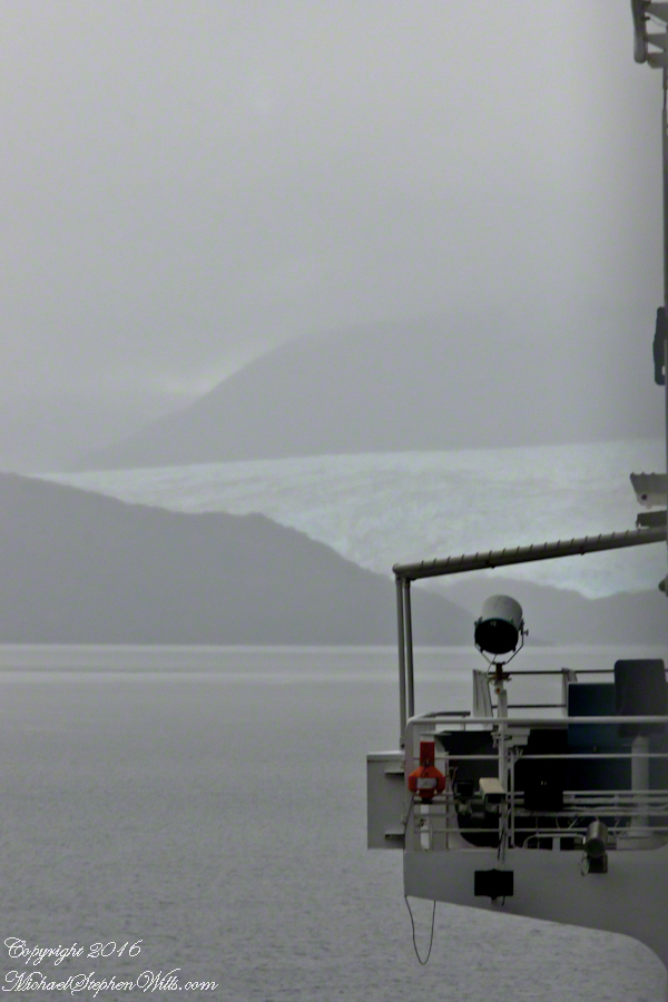 Twenty seven (27) minutes later I used a handheld Sony with variable lens set to 200 mm (1/500 second, F13, ISO800) to capture this image of the ship bridge superimposed on the glacier.