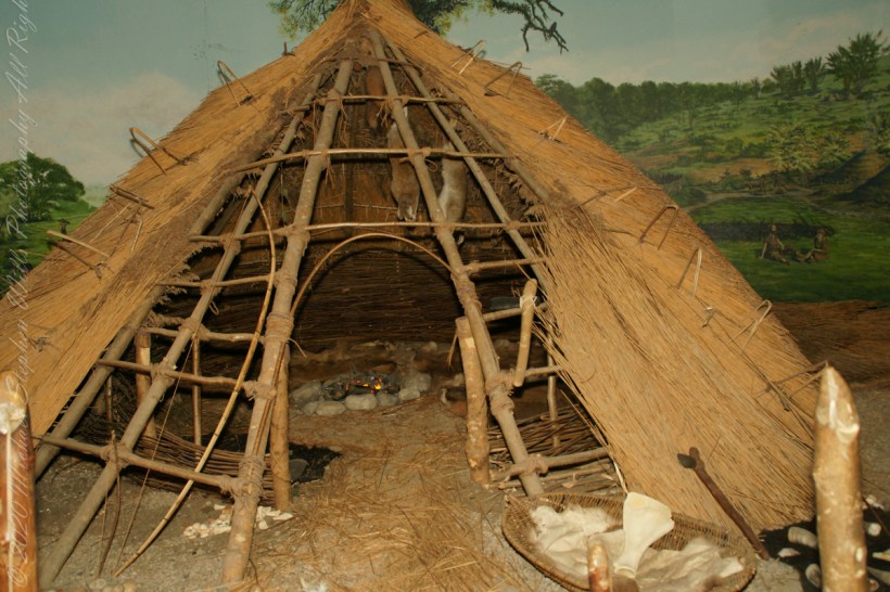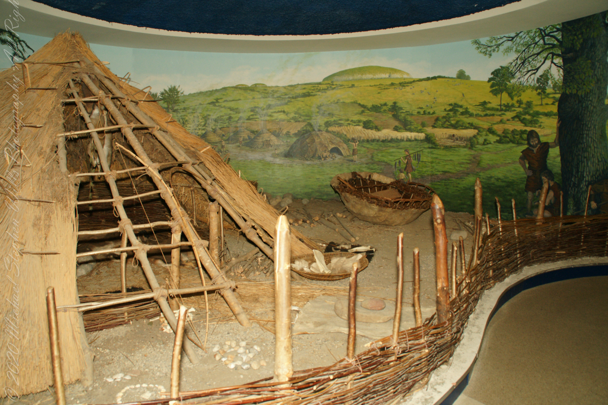 The Brú na Bóinne Visitor Center includes this tableau of the shelter of the ancient farmers who constructed Newgrange: the monument is in the background.