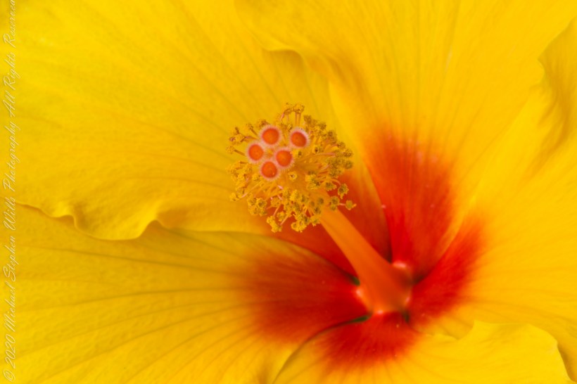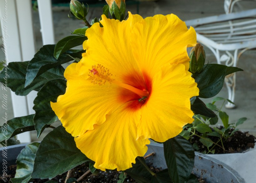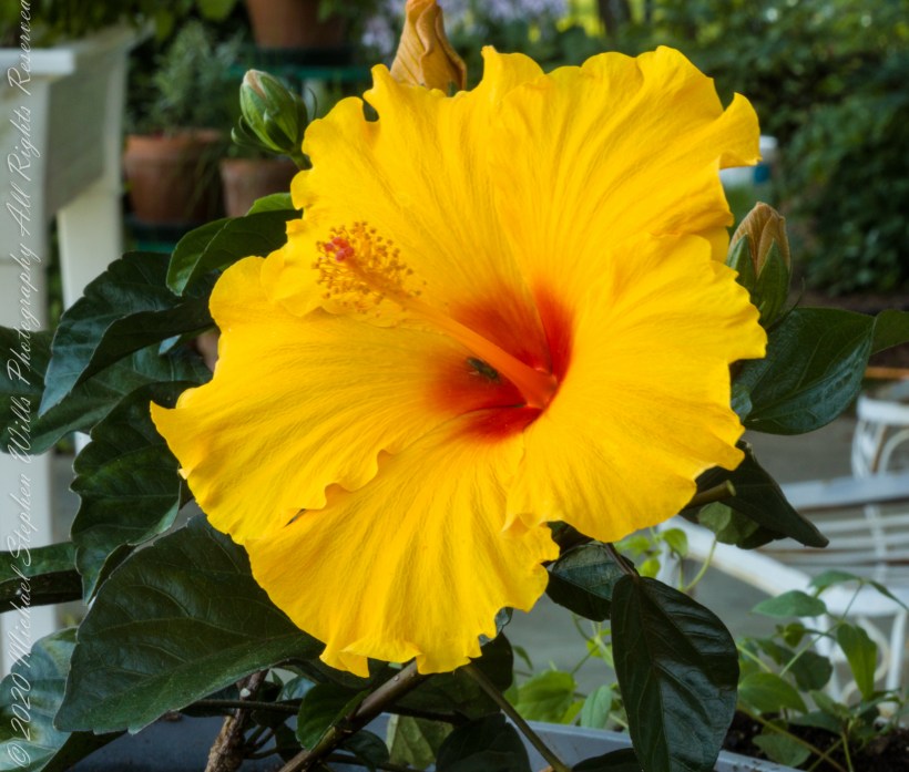 Evening breezes brought to a halt my series of hibiscus bloom photographs, that bloom faded and shriveled, to be replaced by another. I captured the images of this post on a very quiet summer evening. This bloom was facing up closer to vertical that the previous.