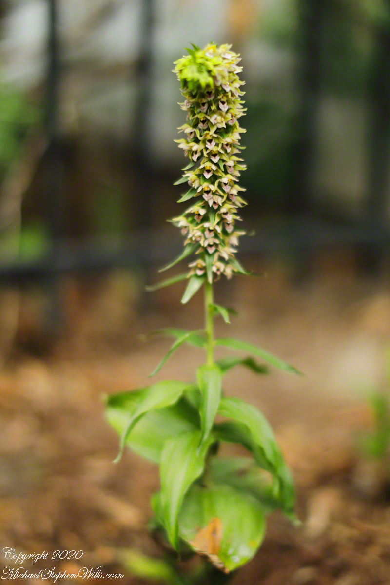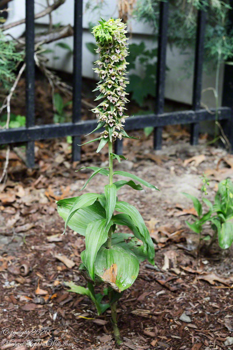 A few years back we fenced in the rose garden as protection against marauding deer. This orchid specimen thrived within the enclosure, possibly turbocharged by rose fertilization.