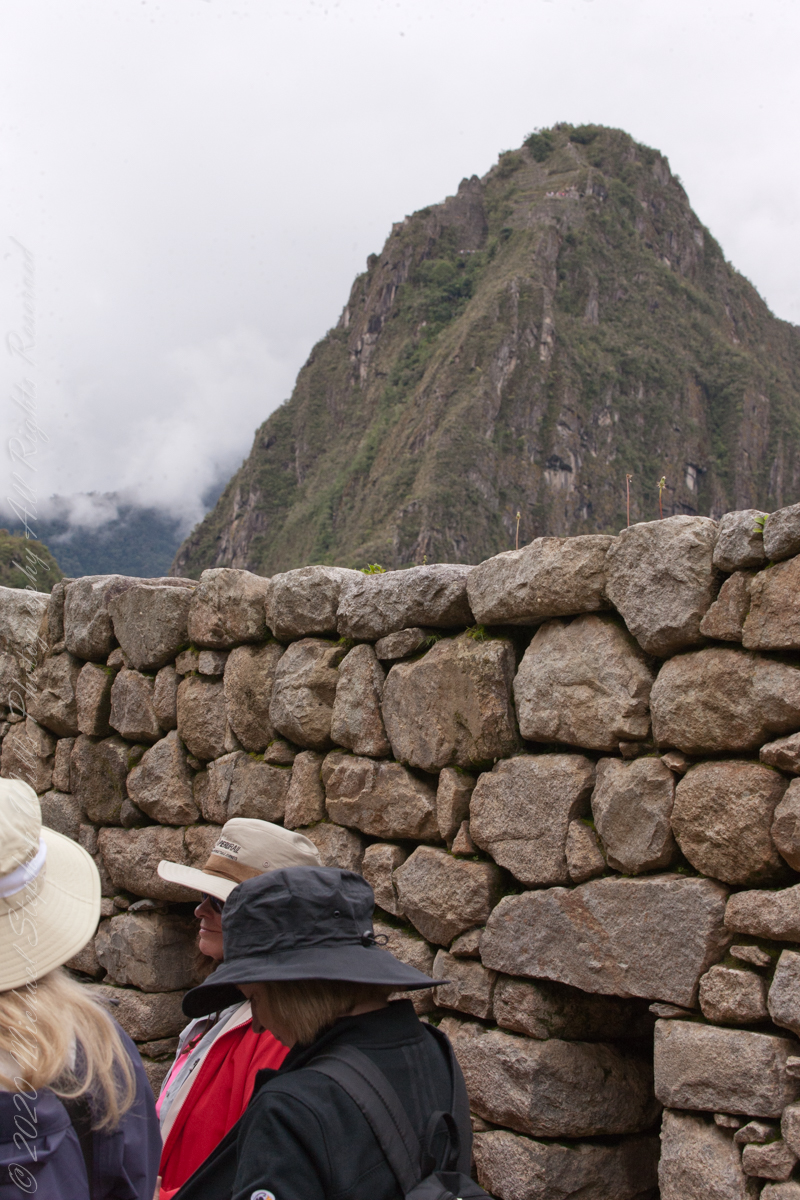 On our way to the Urban Sector of Machu Picchu I capture the peak of Huayna Picchu above a rough stone wall. “Huayna Picchu, Quechua: Wayna Pikchu, is a mountain in Peru around which the Urubamba River bends. It is located in the Cusco Region, Urubamba Province, Machupicchu District. It rises over Machu Picchu, the so-called lost city of the Incas. The Incas built a trail up the side of the Huayna Picchu and built temples and terraces on its top. The peak of Huayna Picchu is 2,693 meters (8,835 ft) above sea level, or about 260 meters (850 ft) higher than Machu Picchu.”