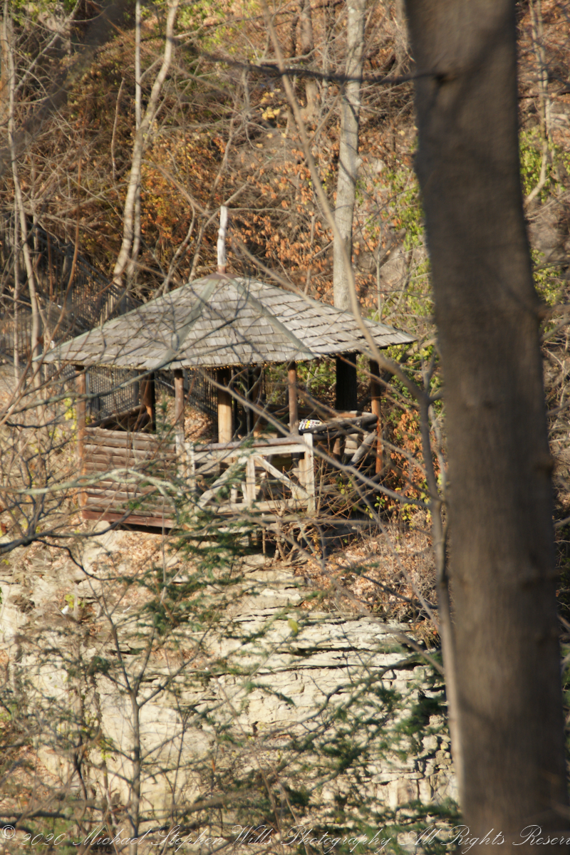 I move further along the trail, and the terrain begins to shift. Fallen leaves create a golden carpet along the path, their crisp shapes overlapping like nature’s confetti celebrating the season. Each step crunches underfoot, adding my own rhythm to the symphony of sounds. The trees overhead are a kaleidoscope of colors—deep golds, fiery oranges, and the occasional flash of red from Virginia Creeper vines (Parthenocissus quinquefolia). Together, the trees create a canopy that filters sunlight, casting dappled patterns on the gorge walls. It’s an ever-changing play of light and shadow, one moment bright and the next subdued, adding a layer of magic to the experience.