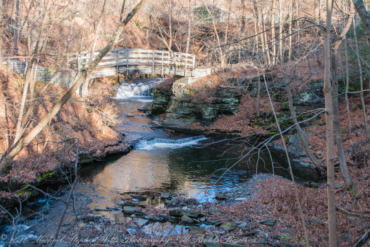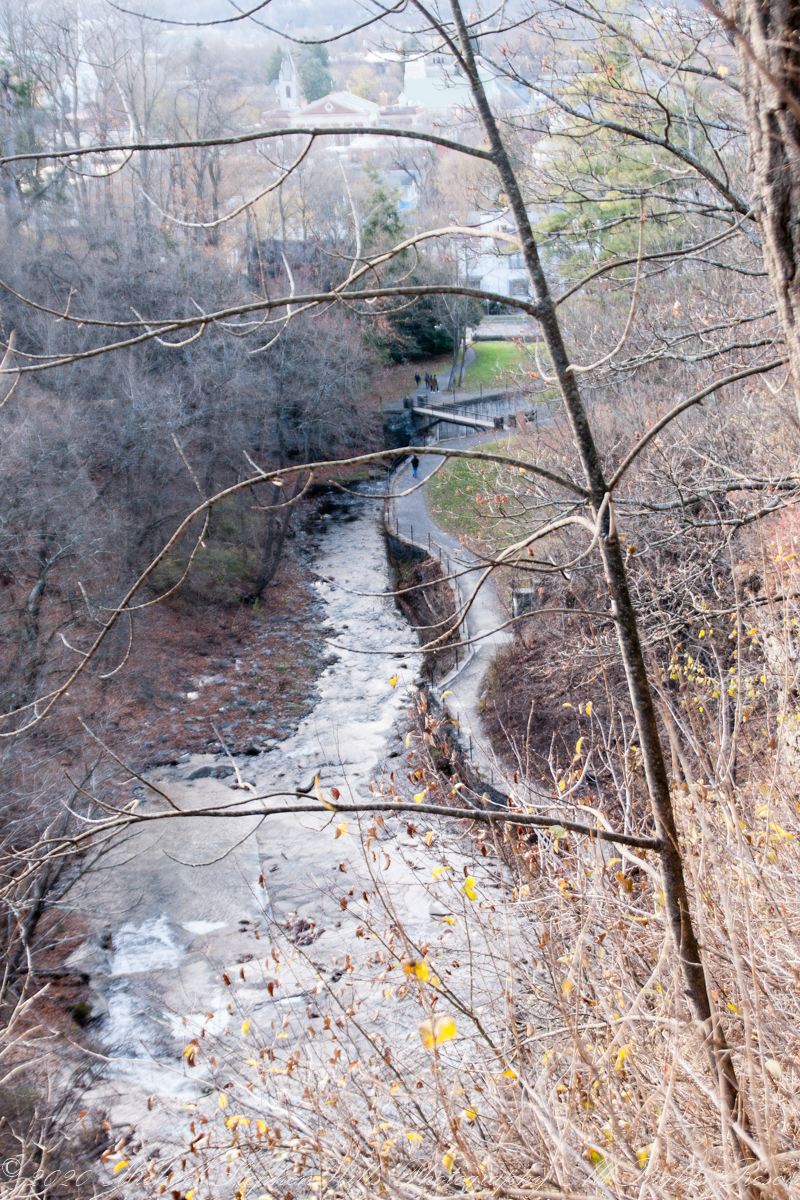 Just a short way in, I notice the First Church of Christ, Scientist perched on the corner of University Avenue and Cascadilla Park Road. The architecture of the church is both quaint and elegant, with its light-colored facade framed by dark trim and roof. Surrounded by foliage, it feels like the church belongs here, as much a part of the landscape as the trees and rocks. The sight of this historic building nestled so close to the gorge reminds me that this wild and ancient place is woven into the fabric of Ithaca’s community life.