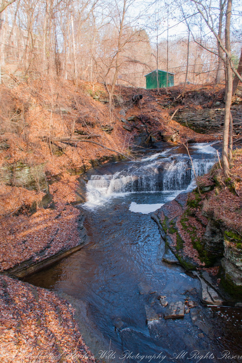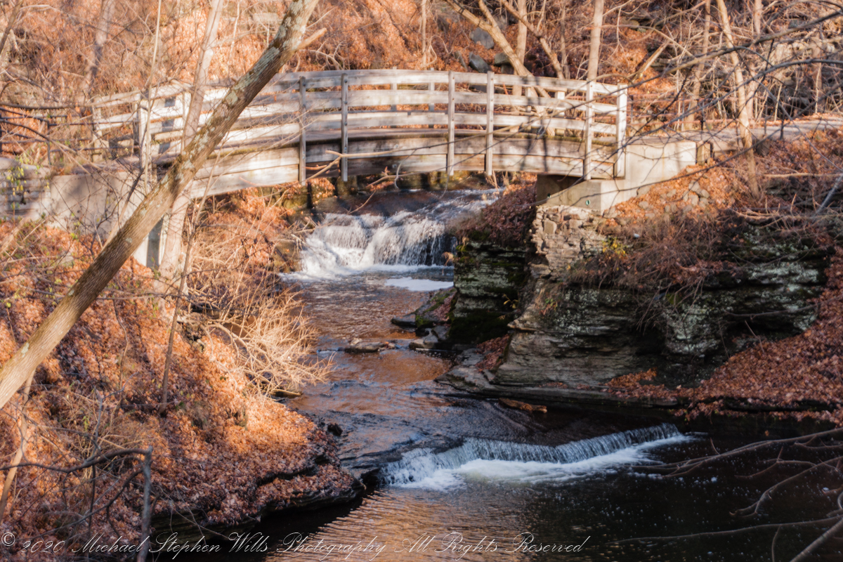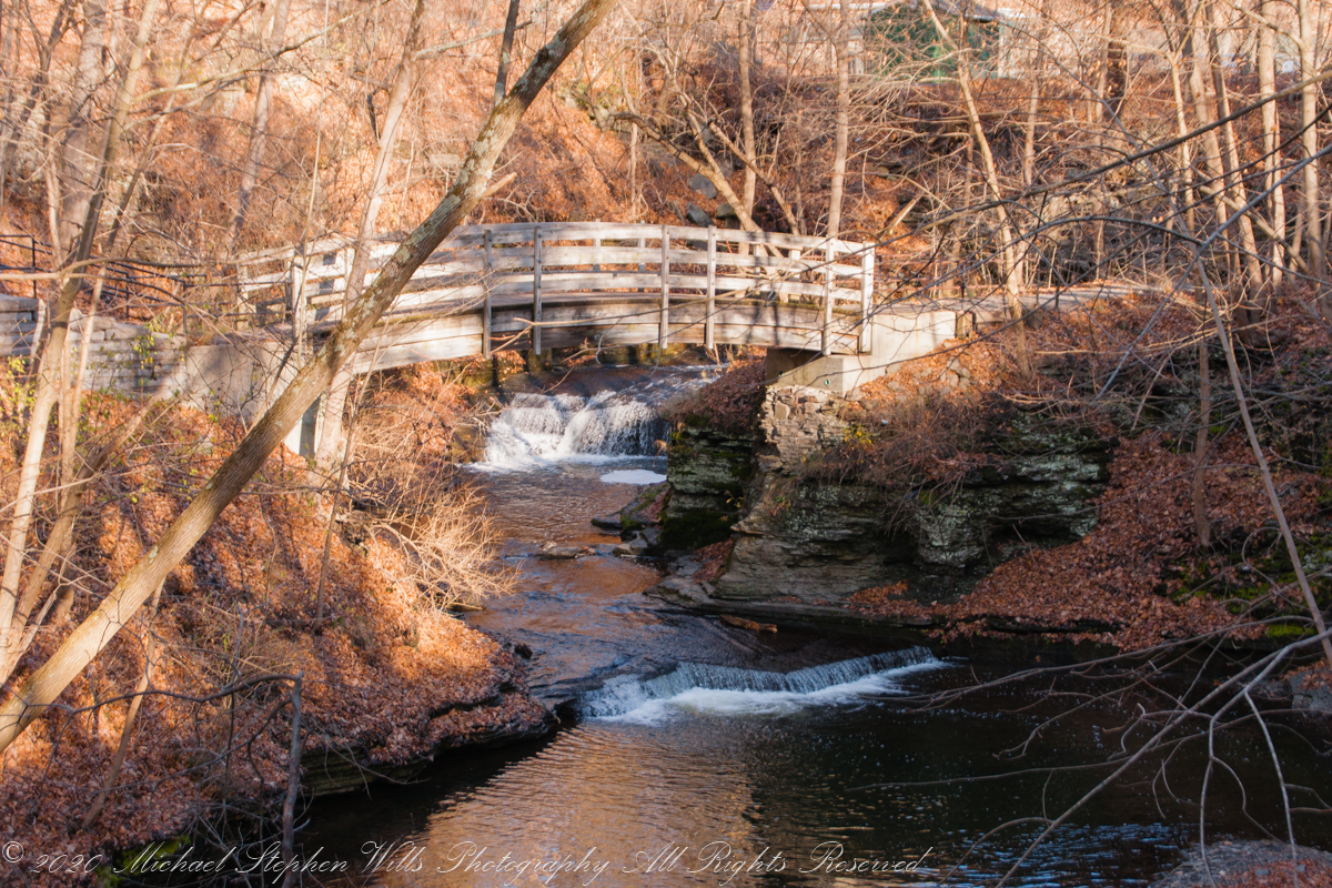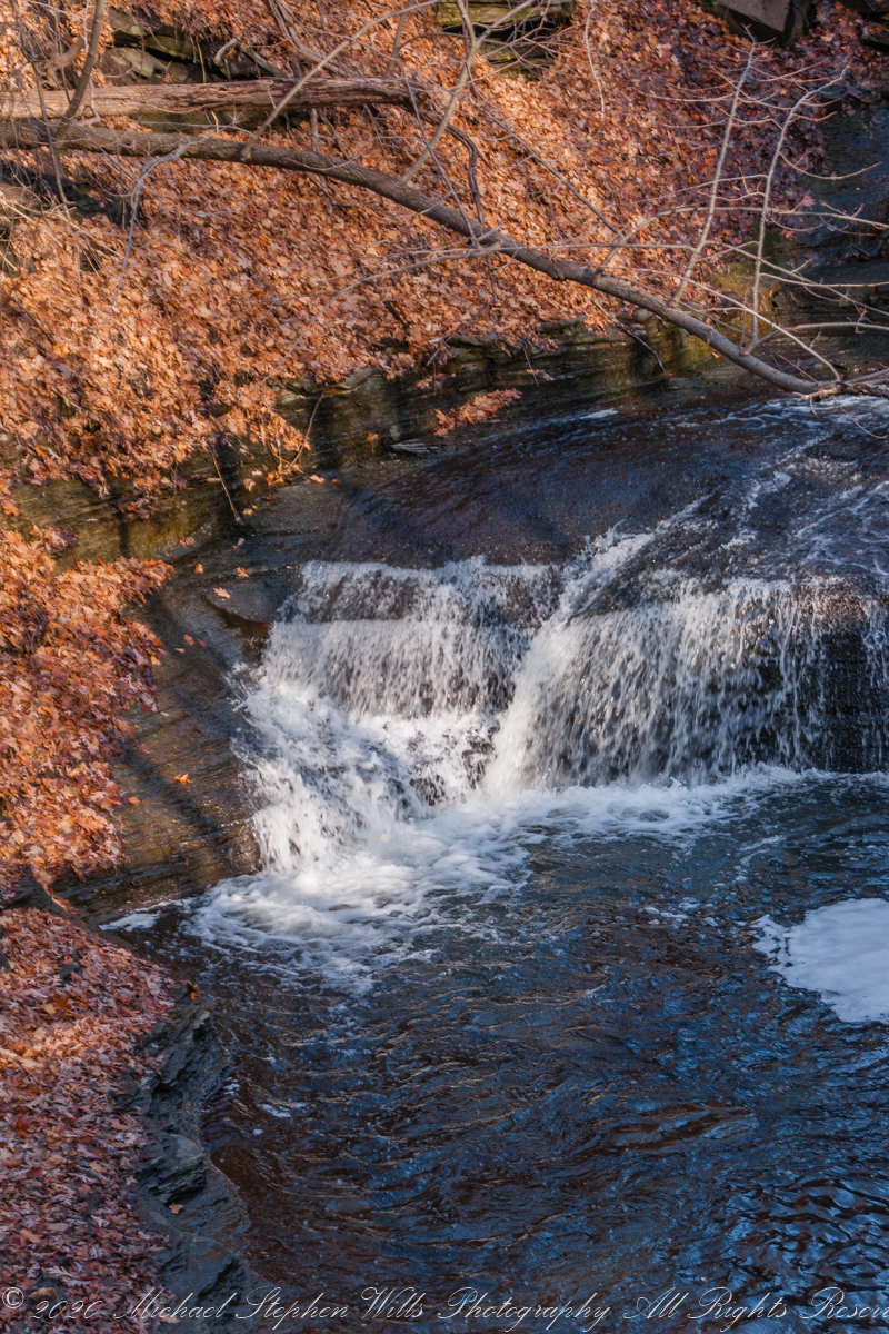 The trail steepens, and I press onward, the sound of the water intensifying as I near a grand waterfall framed by the impressive stone steps leading up to the College Avenue Stone Arch. Each step is littered with leaves, their colors vivid against the worn stone—golds, russets, and the occasional brilliant red, like embers scattered along my path. The waterfall beside me spills down in steady streams, each cascade creating rivulets that catch the light as they flow downward.
