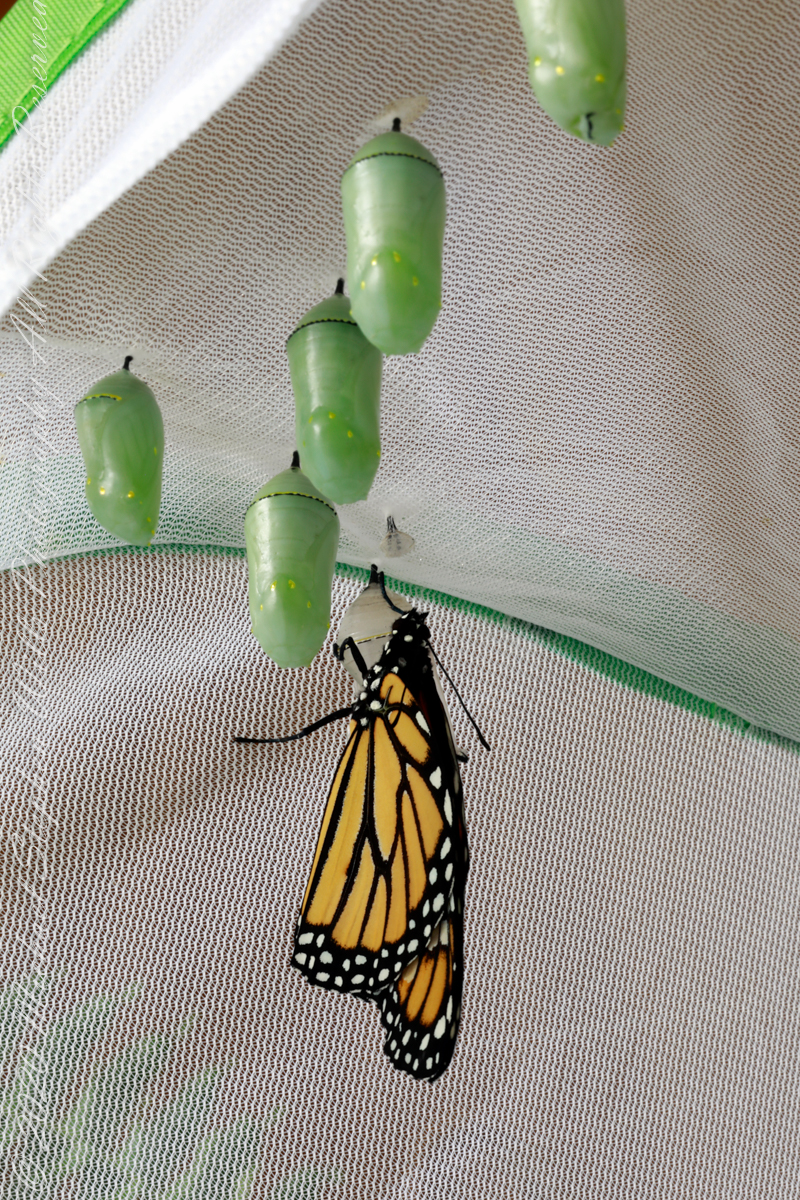 The following photograph and video catch the moments into becoming: the jade lantern has become transparent, darkening, its gold studs glinting like constellation points, and through the thinning walls the folded wings show, orange smoldering under smoke. Inside, old tissues have dissolved into a living broth; imaginal discs—tiny blueprints carried since the egg—have flowered into legs, eyes, and flight. To call it “metamorphosis” is correct; to call it mystery is truer.