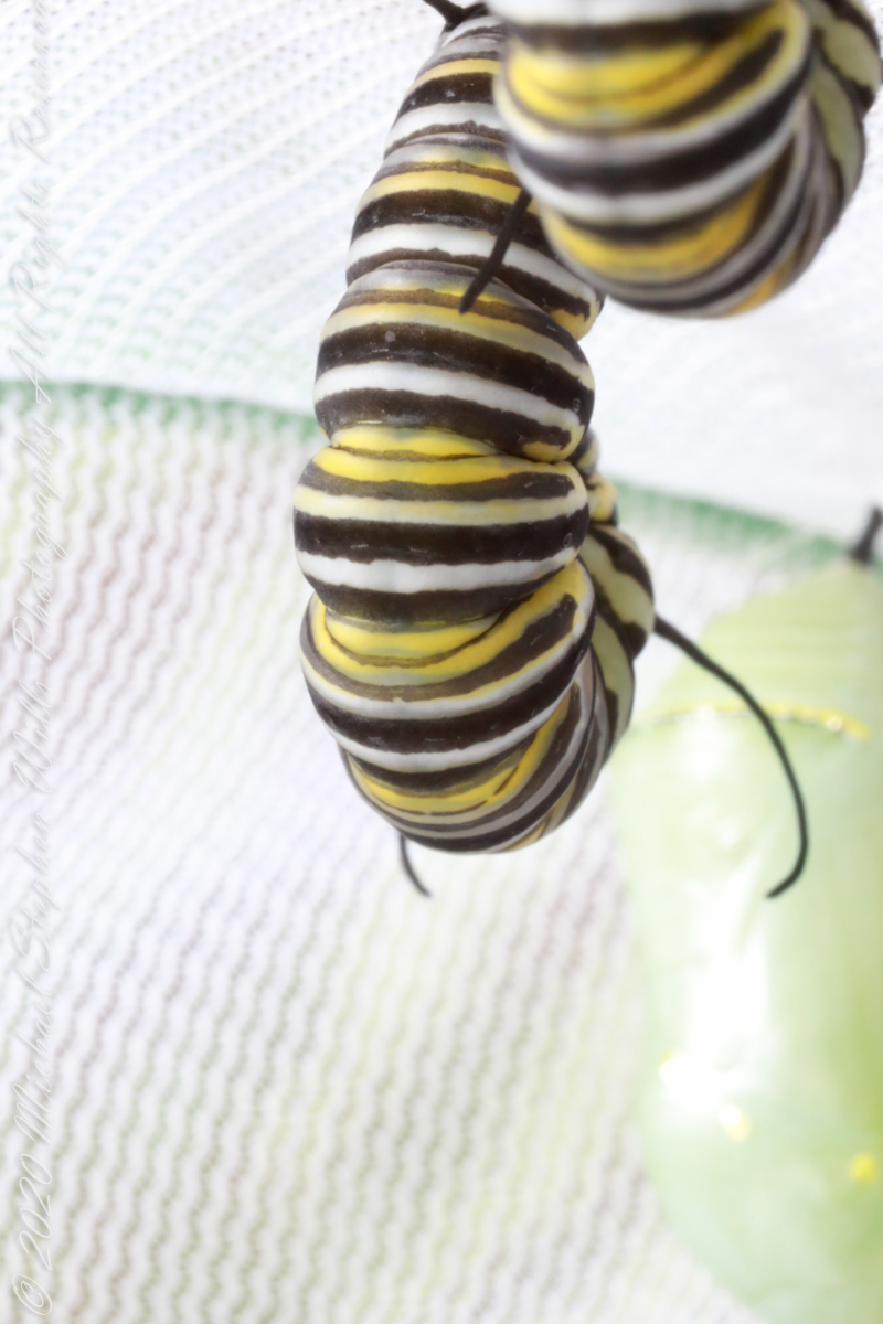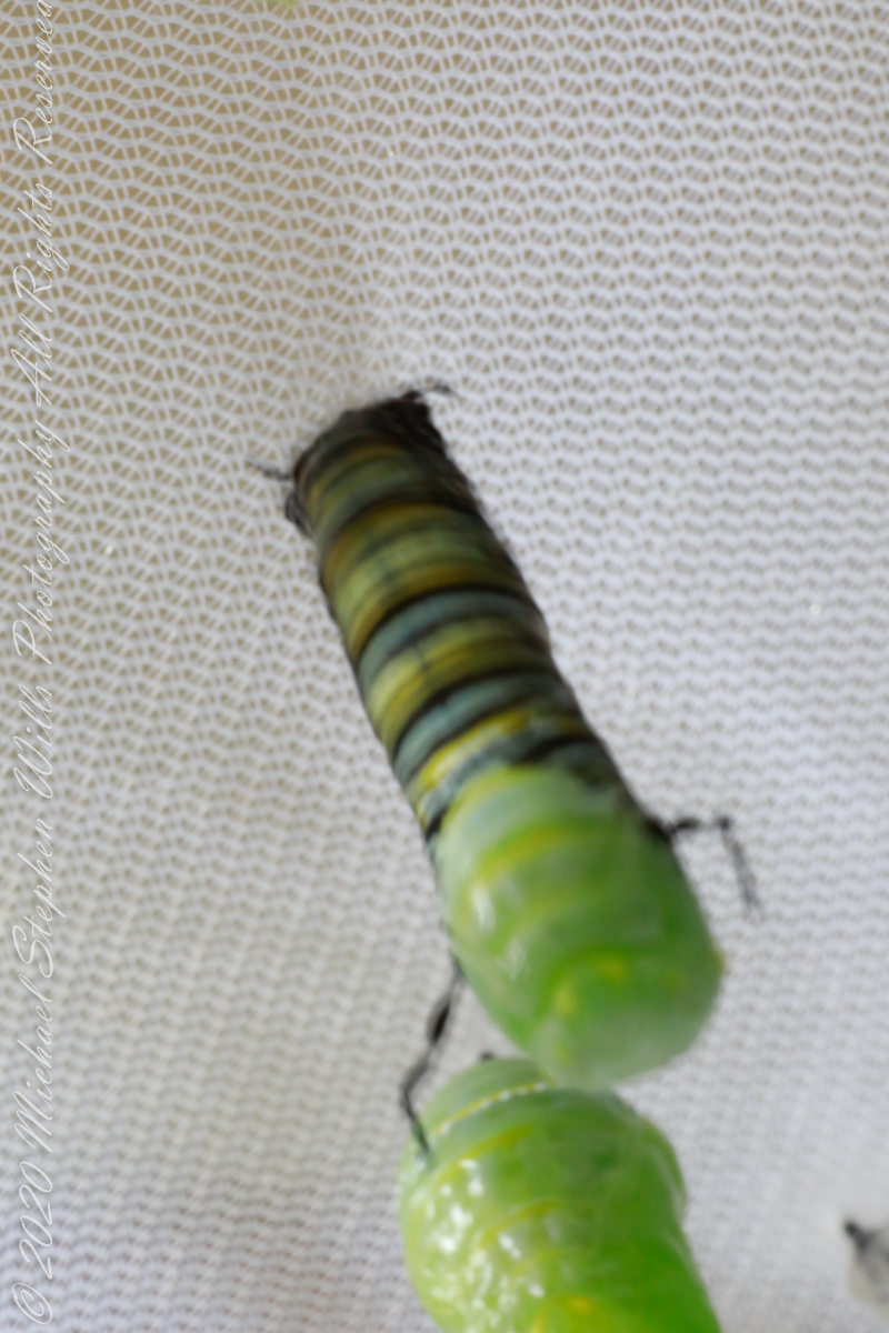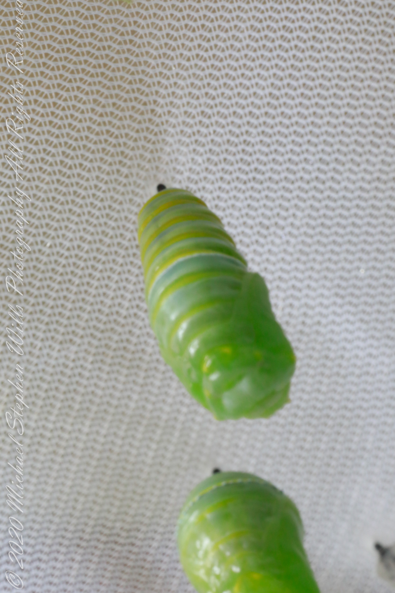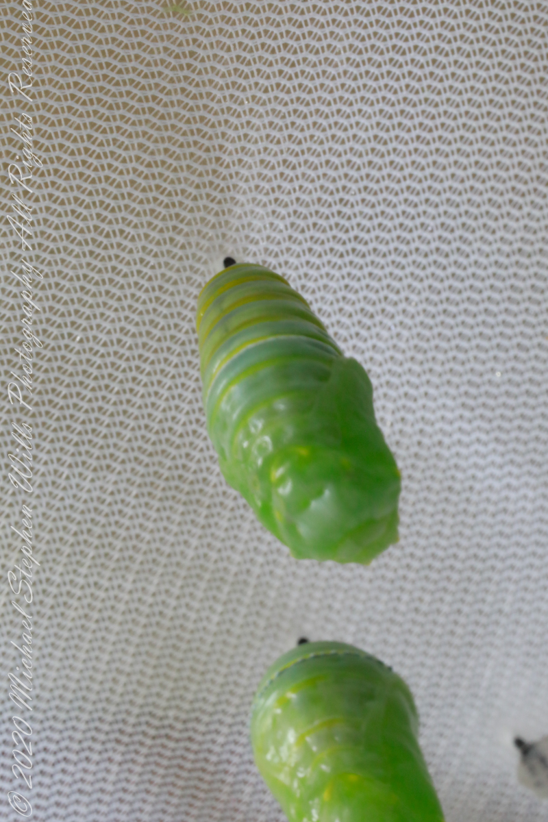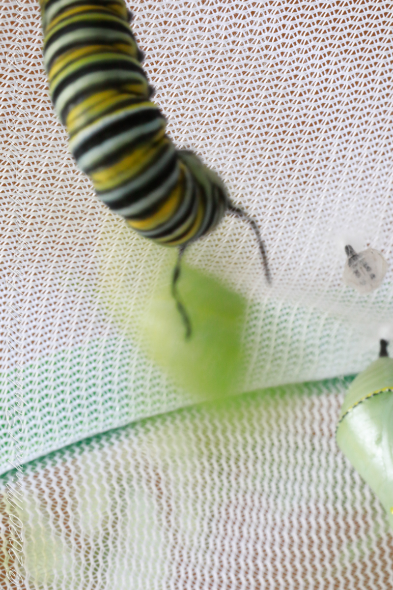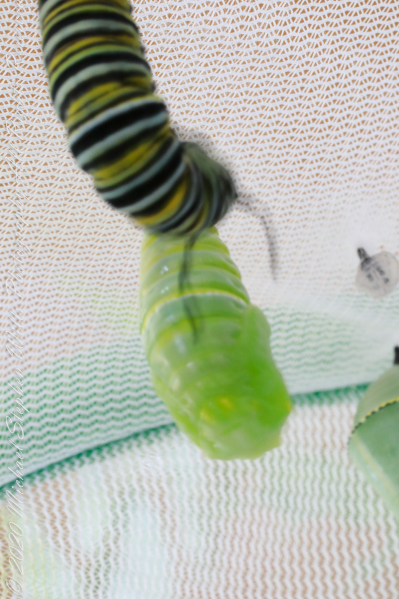 At last a hush. A final meal, a purposeful wander. The caterpillar chooses a high eave of the world—a stem, a stick, the corner of your rearing tent—and hooks itself into a downward J. Within hours the skin splits like a soft zipper; the striped creature pours itself out of itself and seals into a smooth chrysalis.