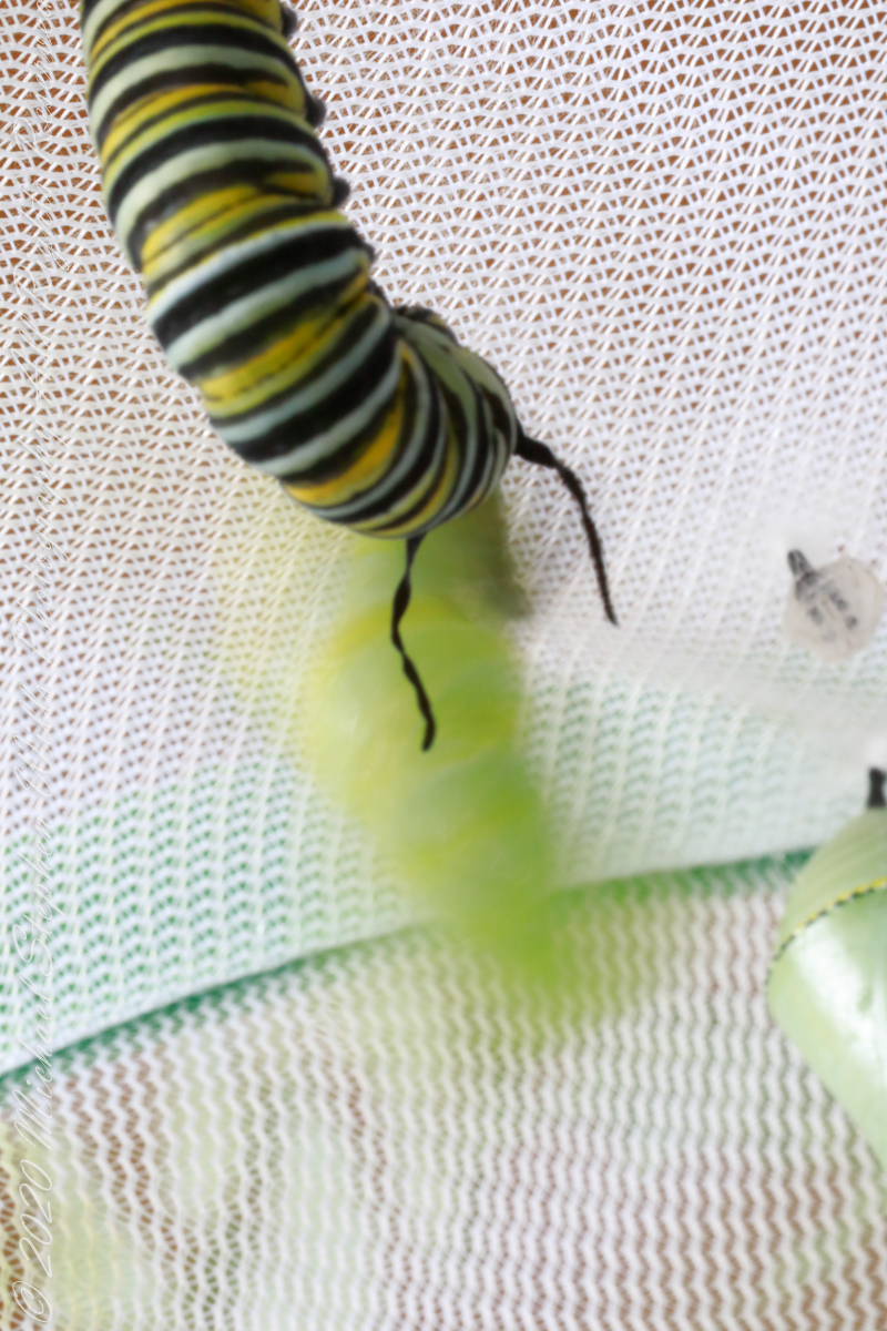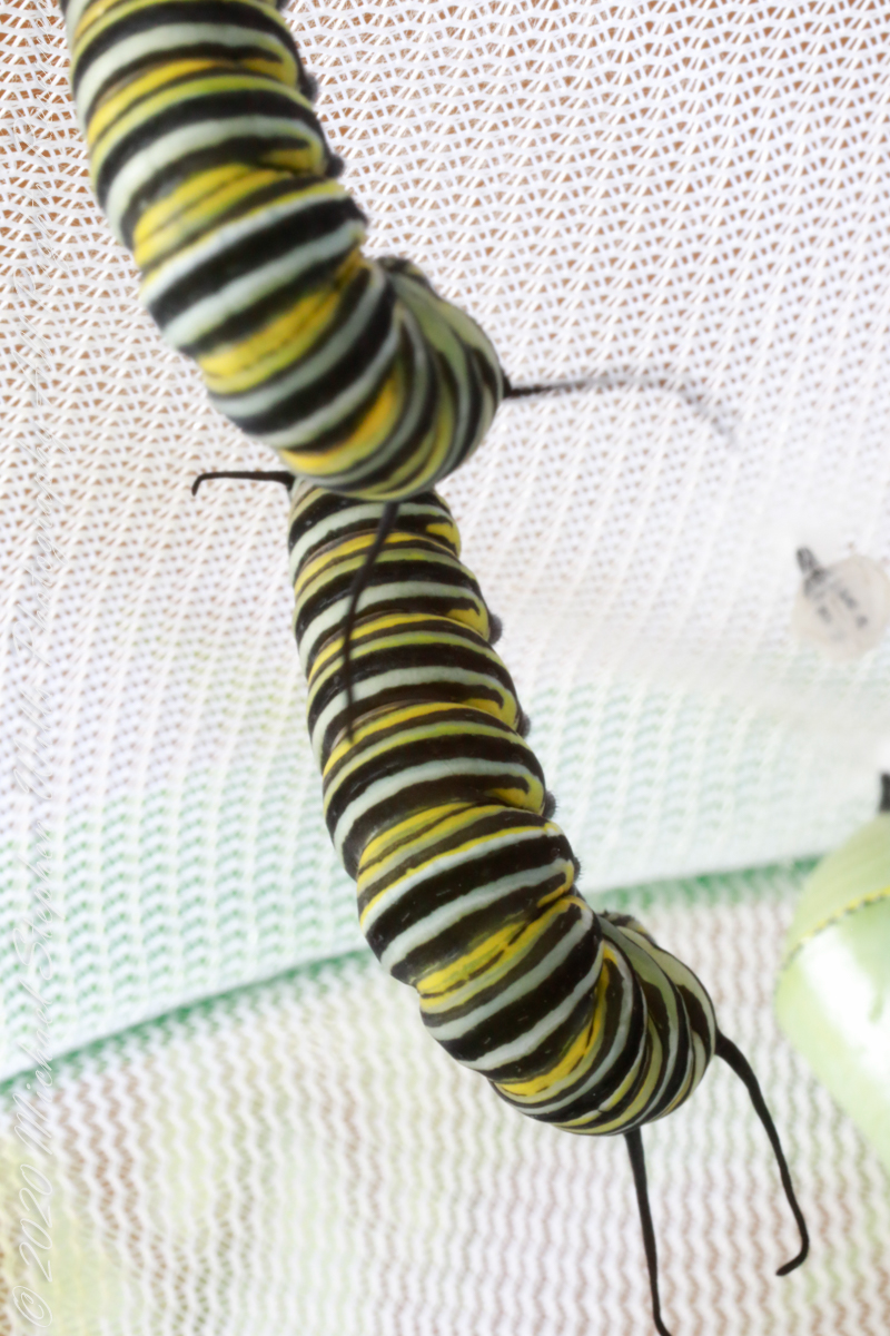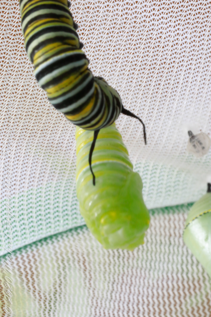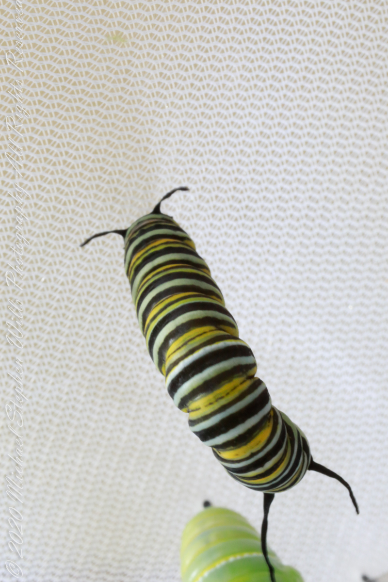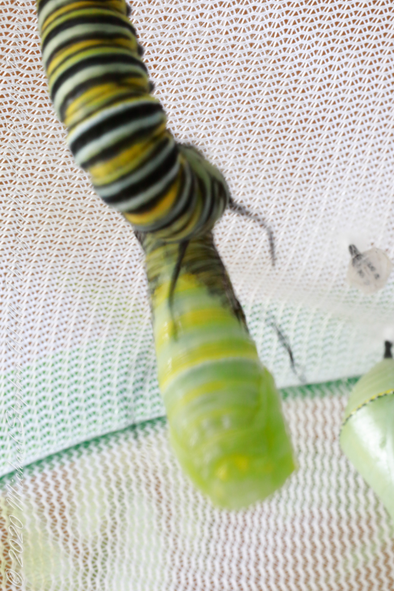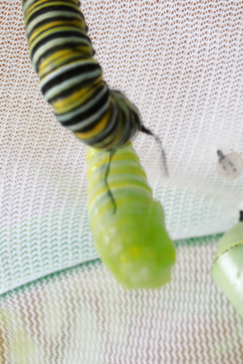 At last a hush. A final meal, a purposeful wander. The caterpillar chooses a high eave of the world—a stem, a stick, the corner of your rearing tent—and hooks itself into a downward J. Within hours the skin splits like a soft zipper; the striped creature pours itself out of itself and seals into a smooth chrysalis.