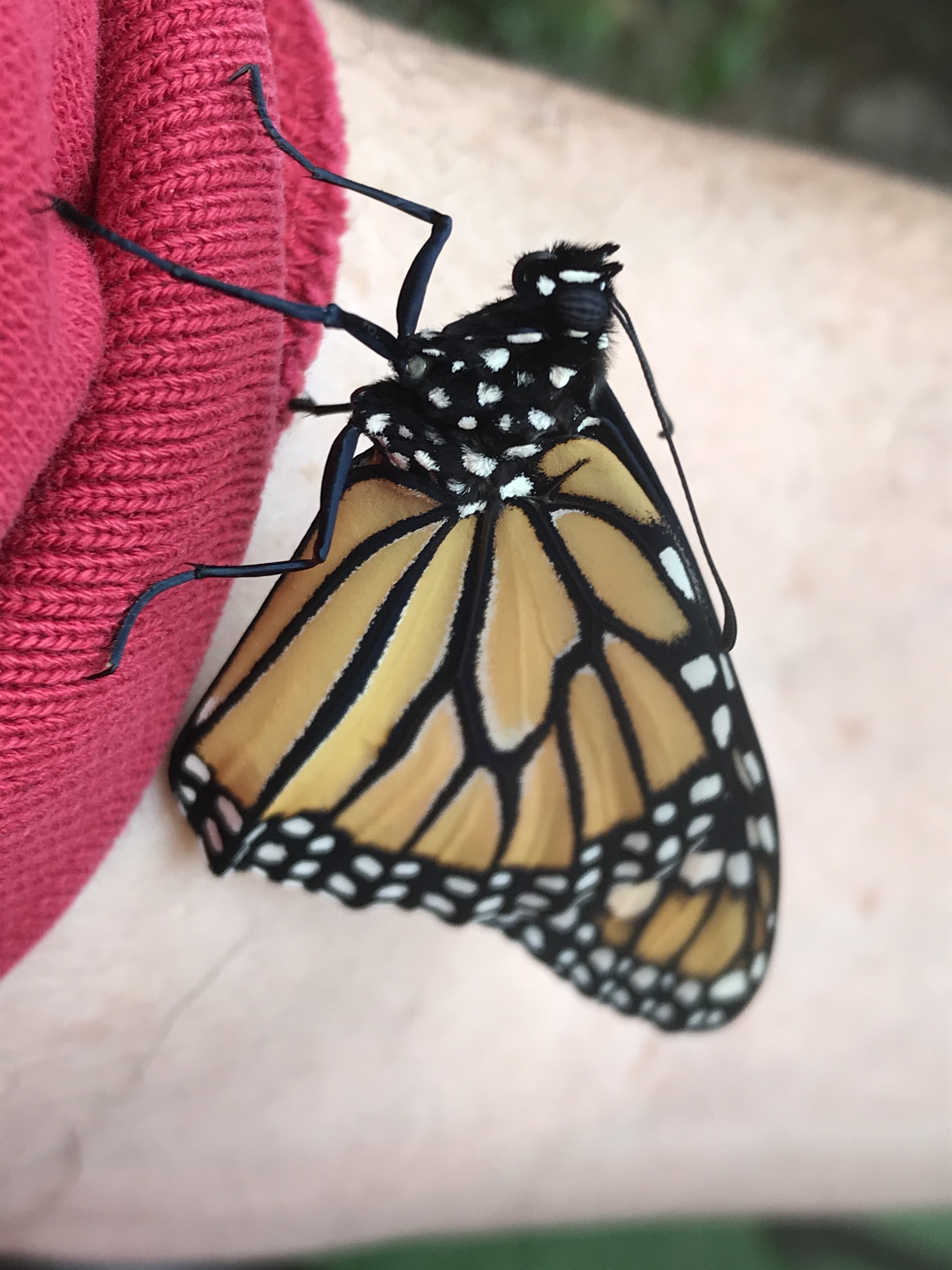 Clinging to my sleeve, this newly emerged Monarch wings dried. It is a process of excreting the fluids pumped into wings, crumpled from folding within the chrysalis, to expand them. The clear drips of water on my arm are this fluid.